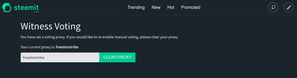 - Scroll down to the bottom, where it says: "You can also choose a proxy that will vote for witnesses for you. This will reset your current witness selection." Underneath that, type "freedomtribe"