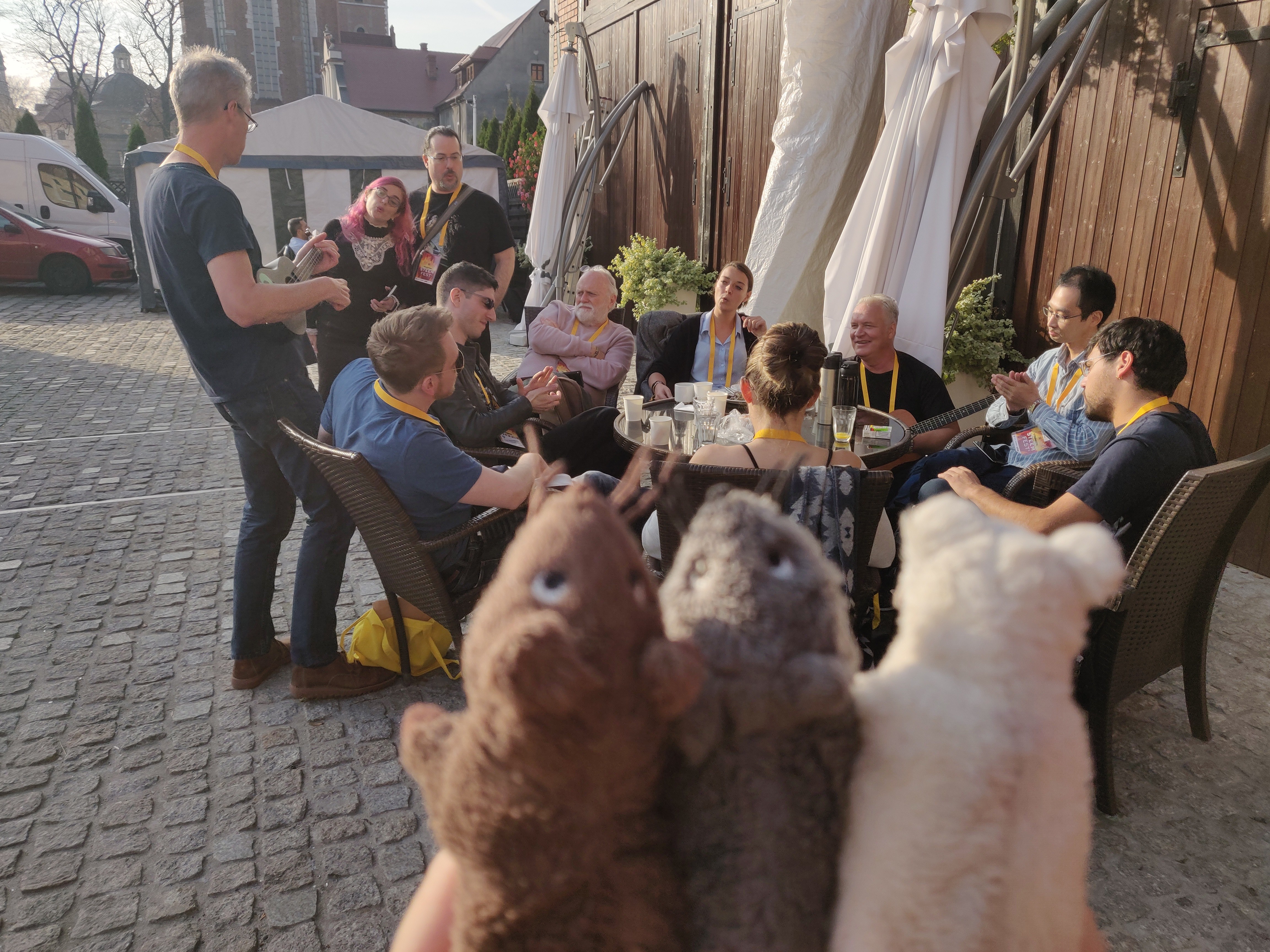 I performed in "A Night of Steem" along with some other talented musicians and if someone has pictures of that I'm grateful to have more as I want to write a post about it. I will write more about my own impressions but this post is a bit unconventional, Steemfest through the eyes of my fufunchis who came inside my bag and enjoyed all the sweet experiences (shhh, they didn't pay for the ticket and came smuggled inside my bag). It was a fun and sweet thing to do and I had promised my friends @pechichemena 🐖 and @paintingangels that I would do this and update them daily, so I was sending all these pics to @helpie discord server for my friends to enjoy the experience. So all pictures taken from phone, not fancy ones this time, just the spontaneity of the moments.