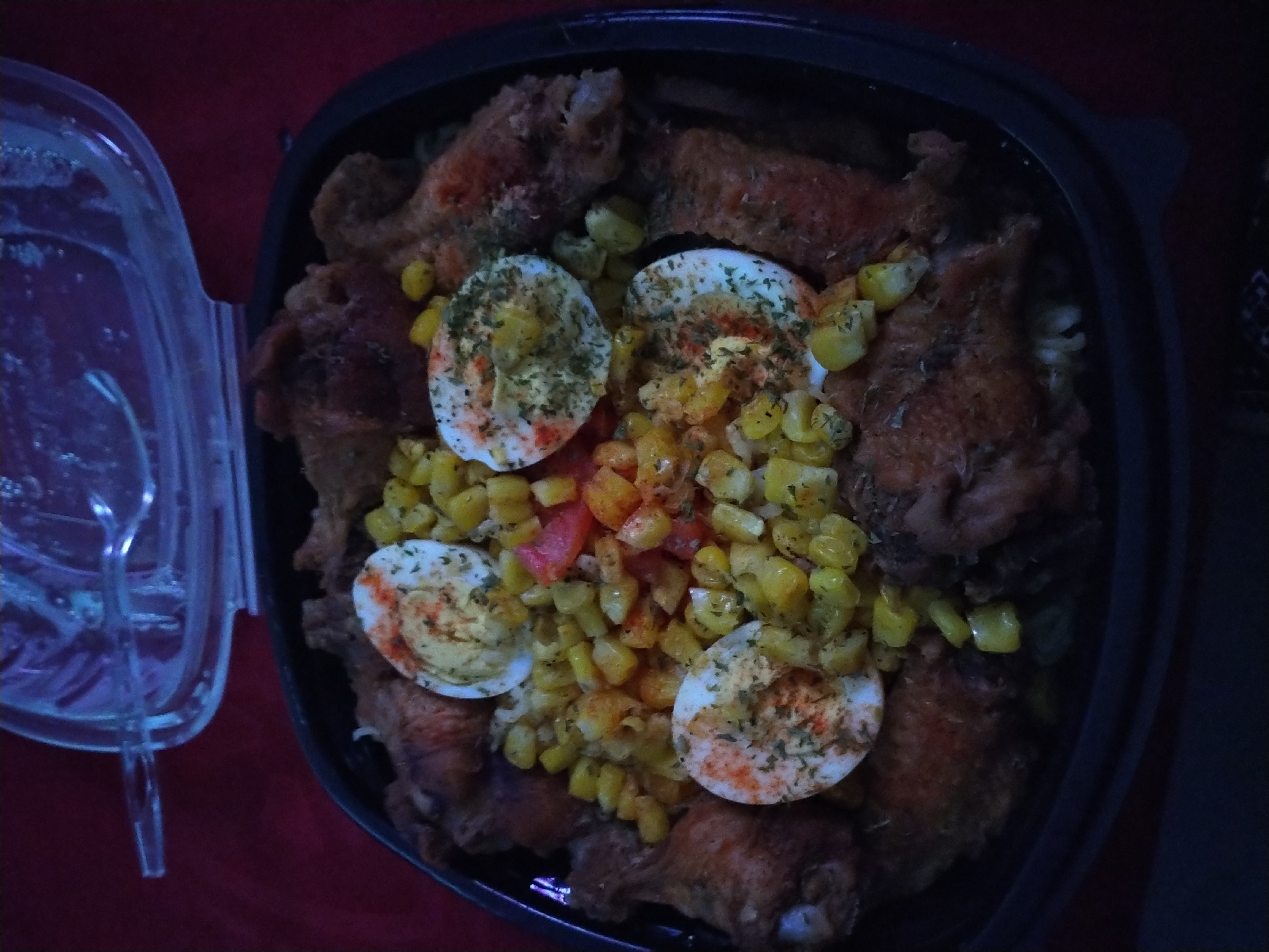 Whenever I bake meats, I save the broth and freeze for later. This dish is consist of spaghetti pasta, chicken, corn cut off the cob, boiled eggs and the chicken broth, very flavorful.