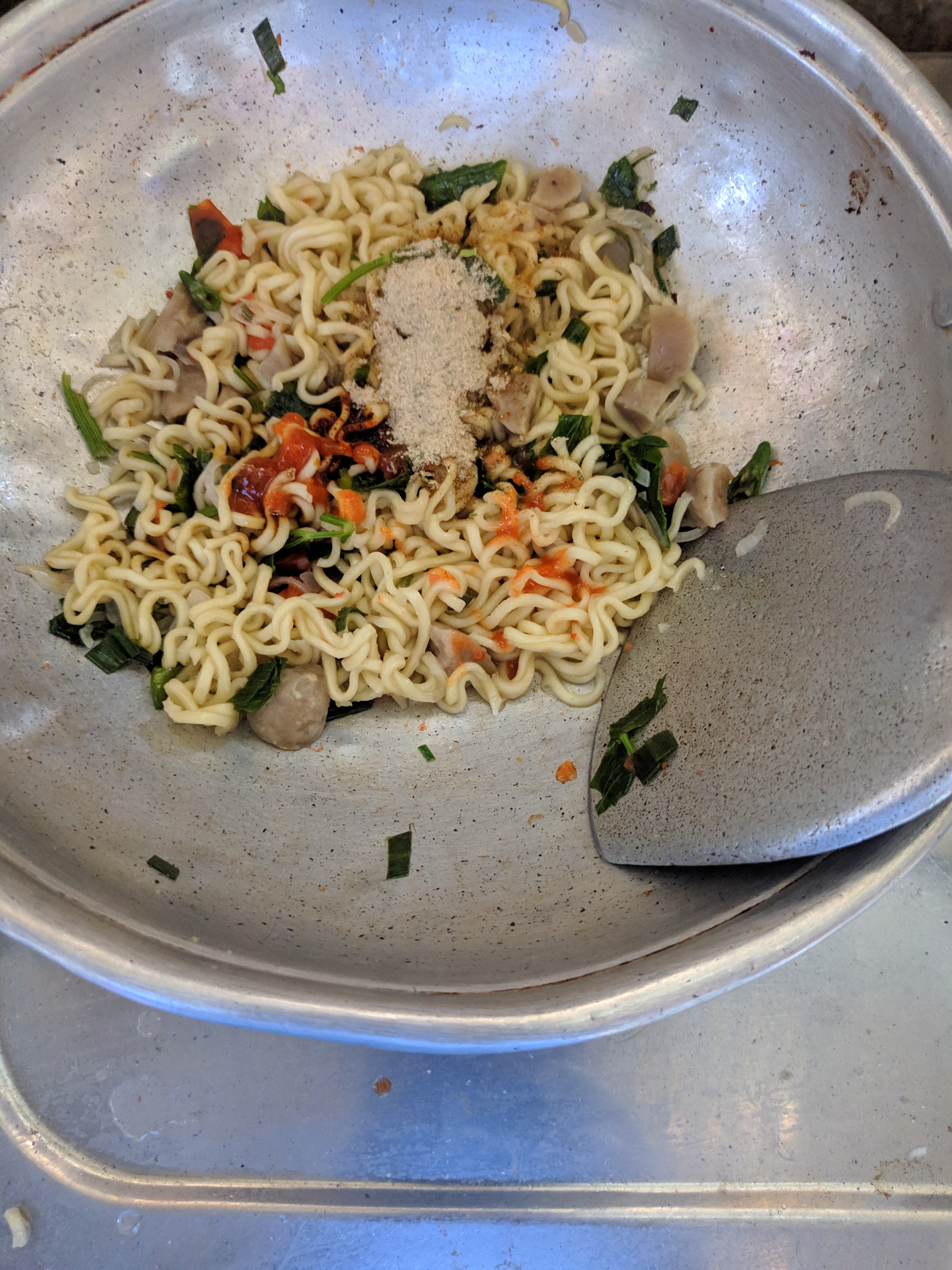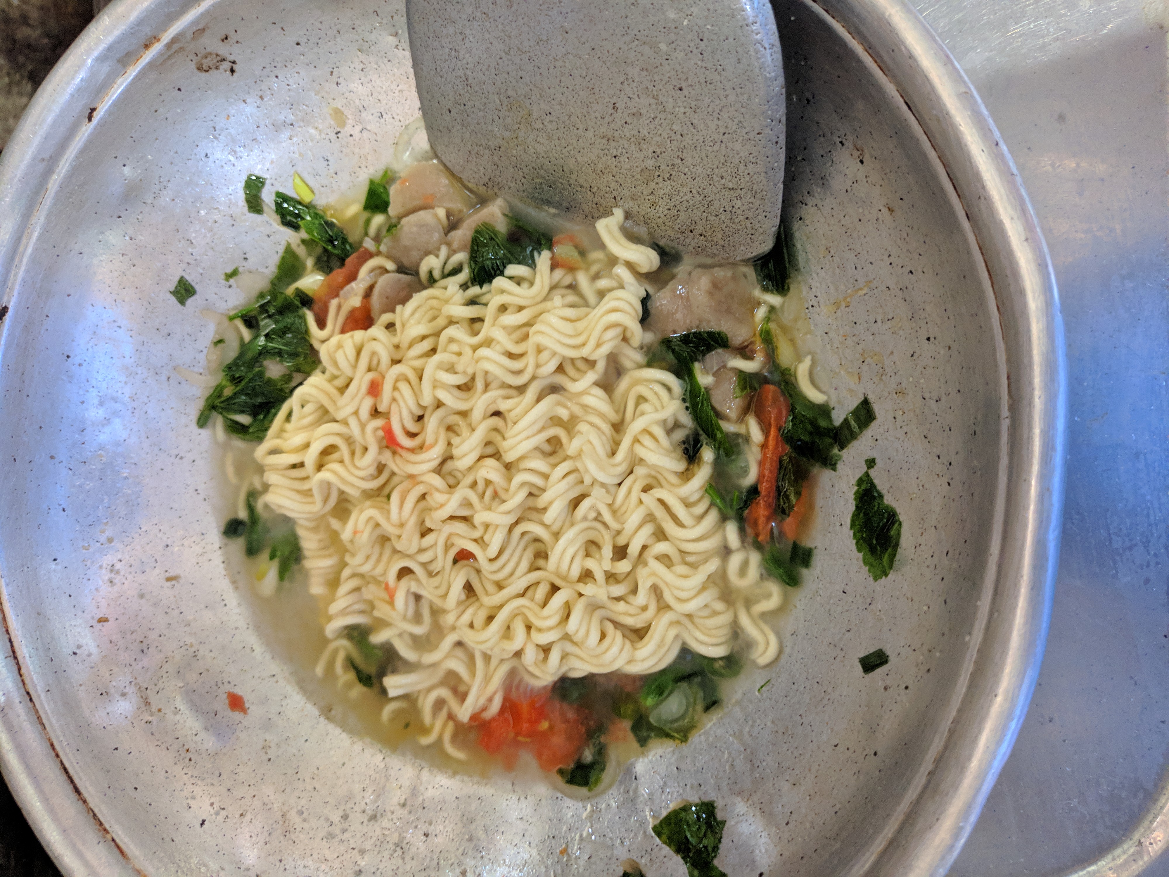Campurkan air secukupnya dan tunggu hingga air mendidih, setelah mendidih masukkan mie instan dan tunggu hingga matang.