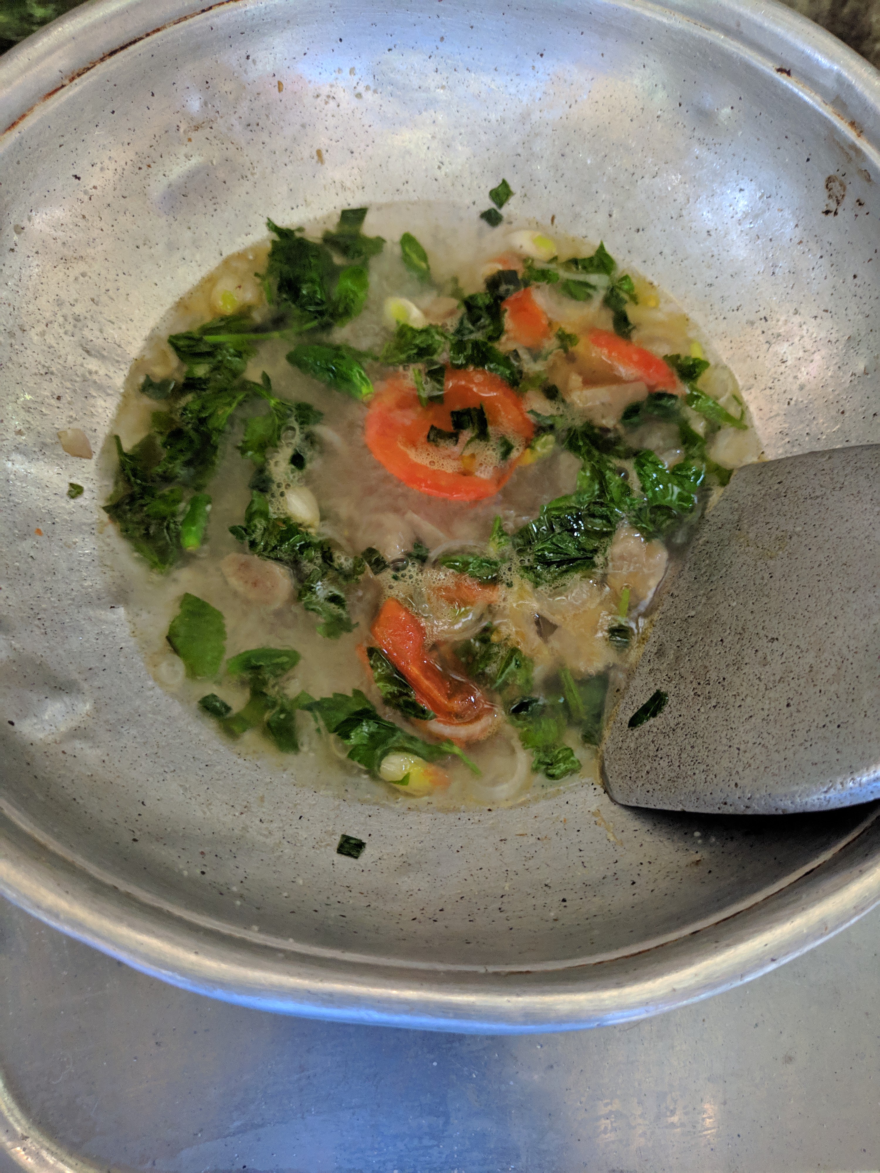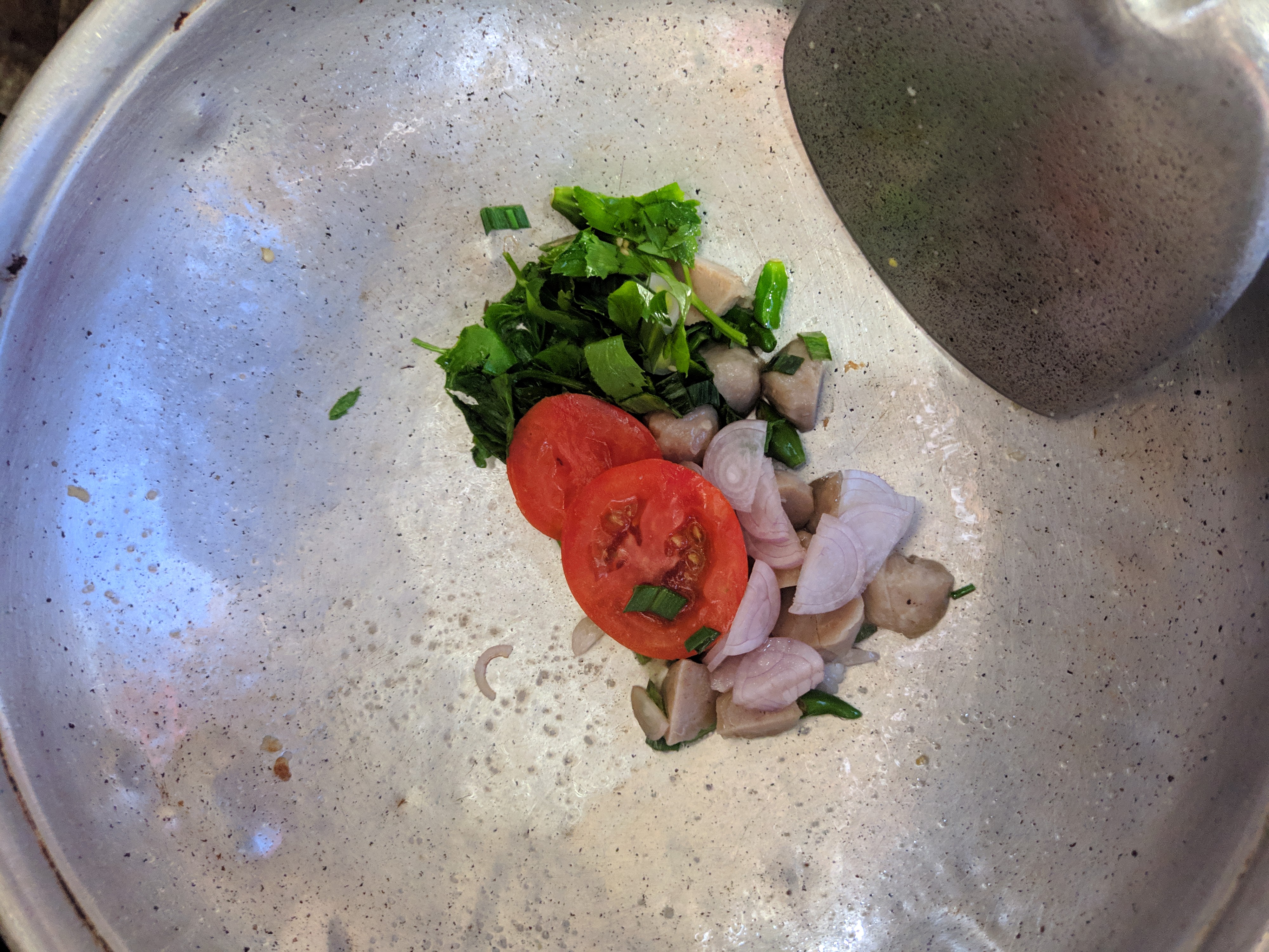 Tumis bawang, daun sop, daun prei, tomat, cabai dan bakso terlebih dahulu hingga berubah warna dan mengeluarkan aroma harum.