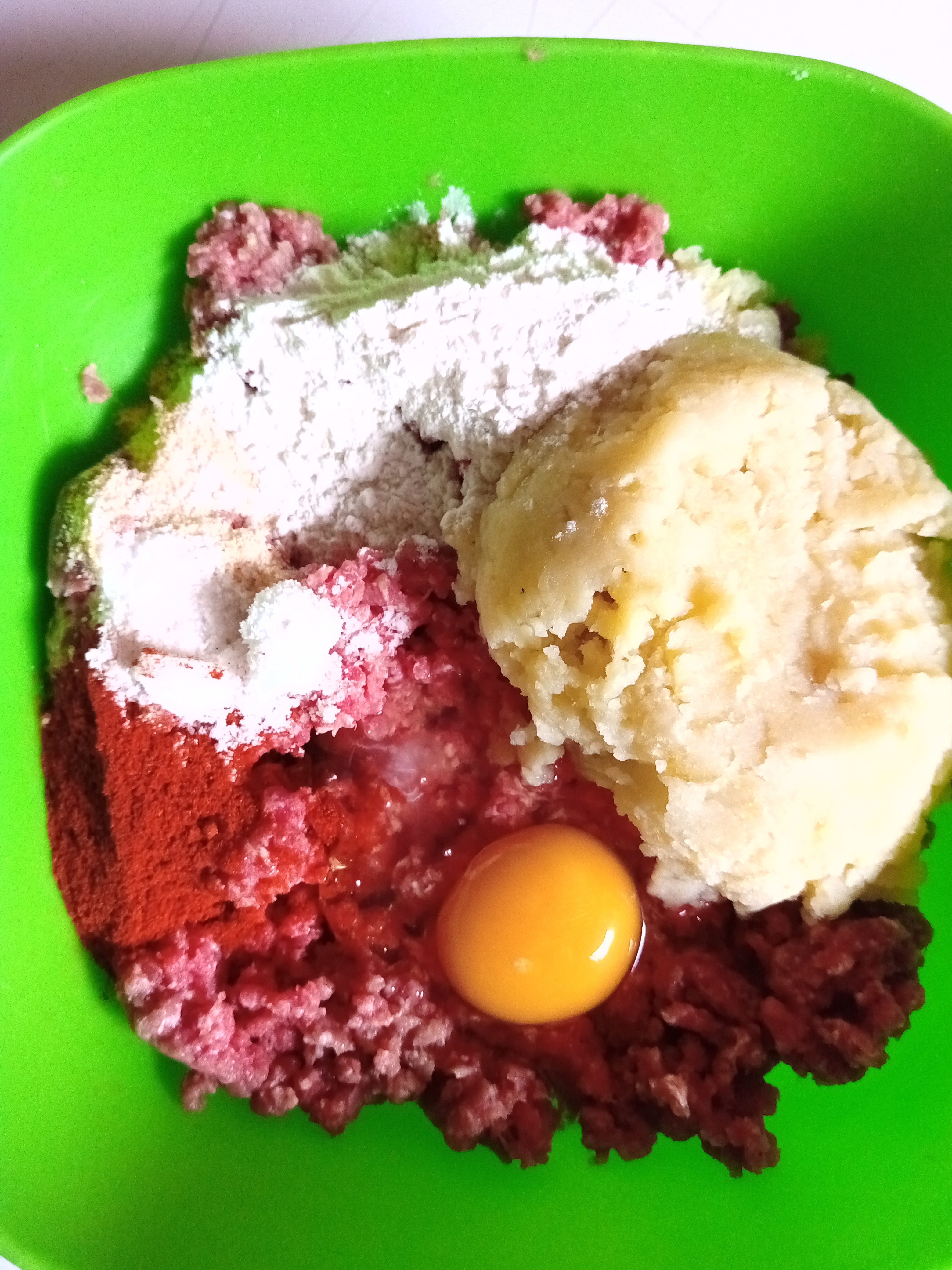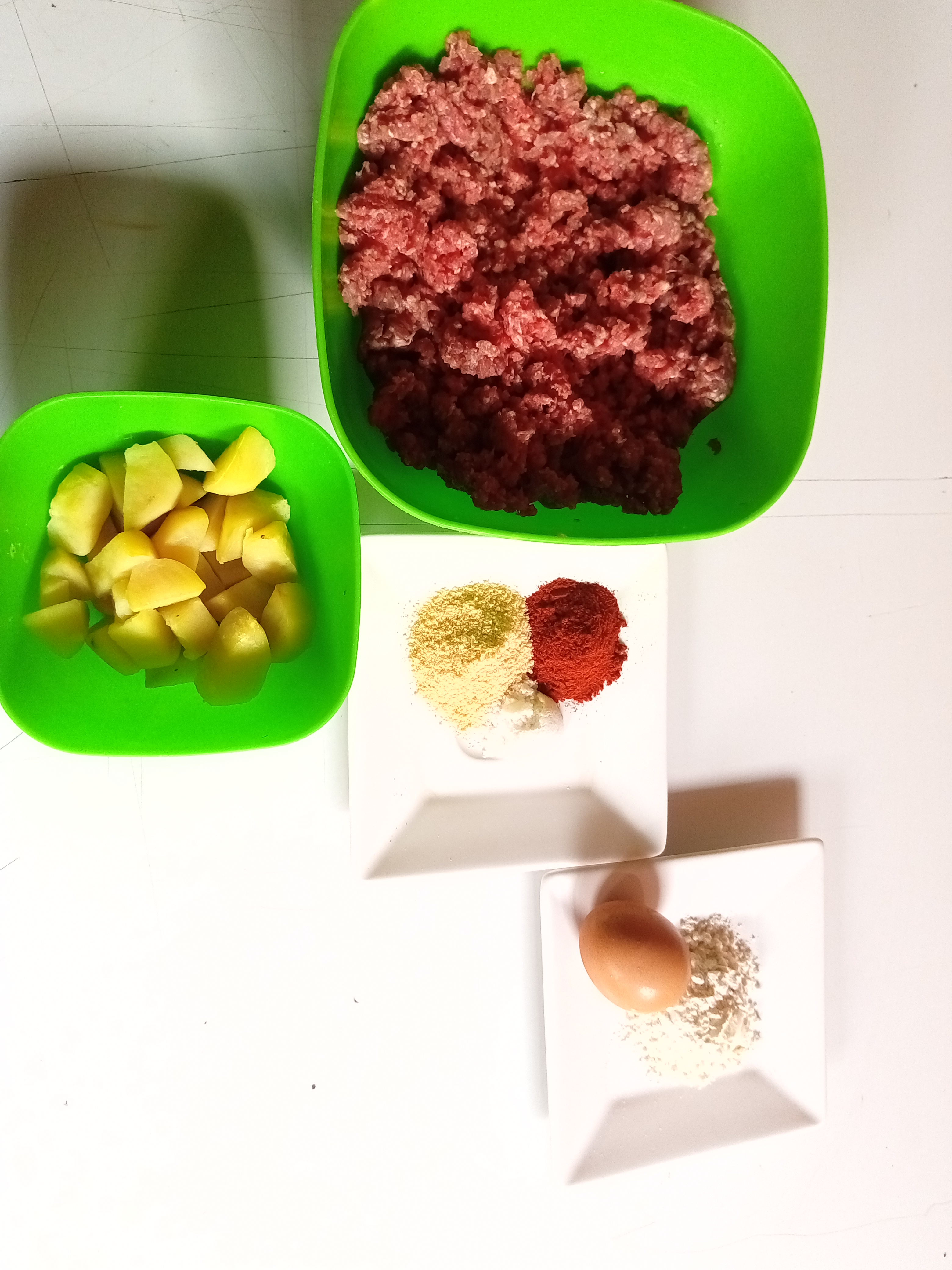 Comenzé lavando, pelando y cortando en cuadritos las papá para luego ponerlas a cocinar hasta que estén blandas, Luego que estén listas las papas las trituramos hasta hacer un puré, dicho puré lo mezclaremos con la carne molida junto con el huevo, harina y las especias, mezclamos e integramos muy bien todo. Luego de que hayamos integrado todo Comenzamos hacer bolitas para luego aplastarlos y hacerles un agujero dando así la forma de rosca, después la llevamos a refrigerador una media hora.