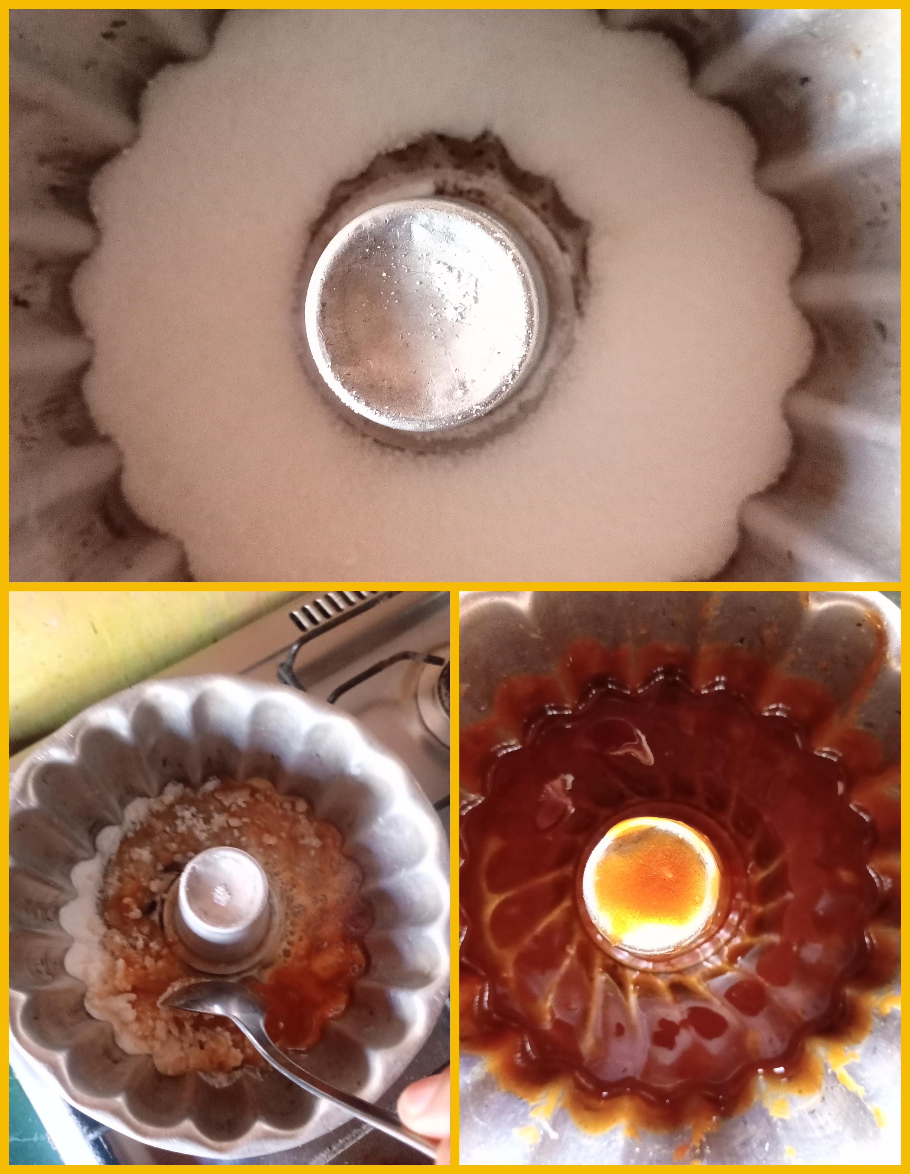 Comenzamos realizando el caramelo, tomamos 5 cucharadas de azúcar y la vertemos sobre el molde, la llevamos a fuego medio hasta que el azúcar se derrita y tomo un color ámbar, lo esparcimos bien sobre el molde y reservamos para luego comenzar a preparar las demás mezclas.