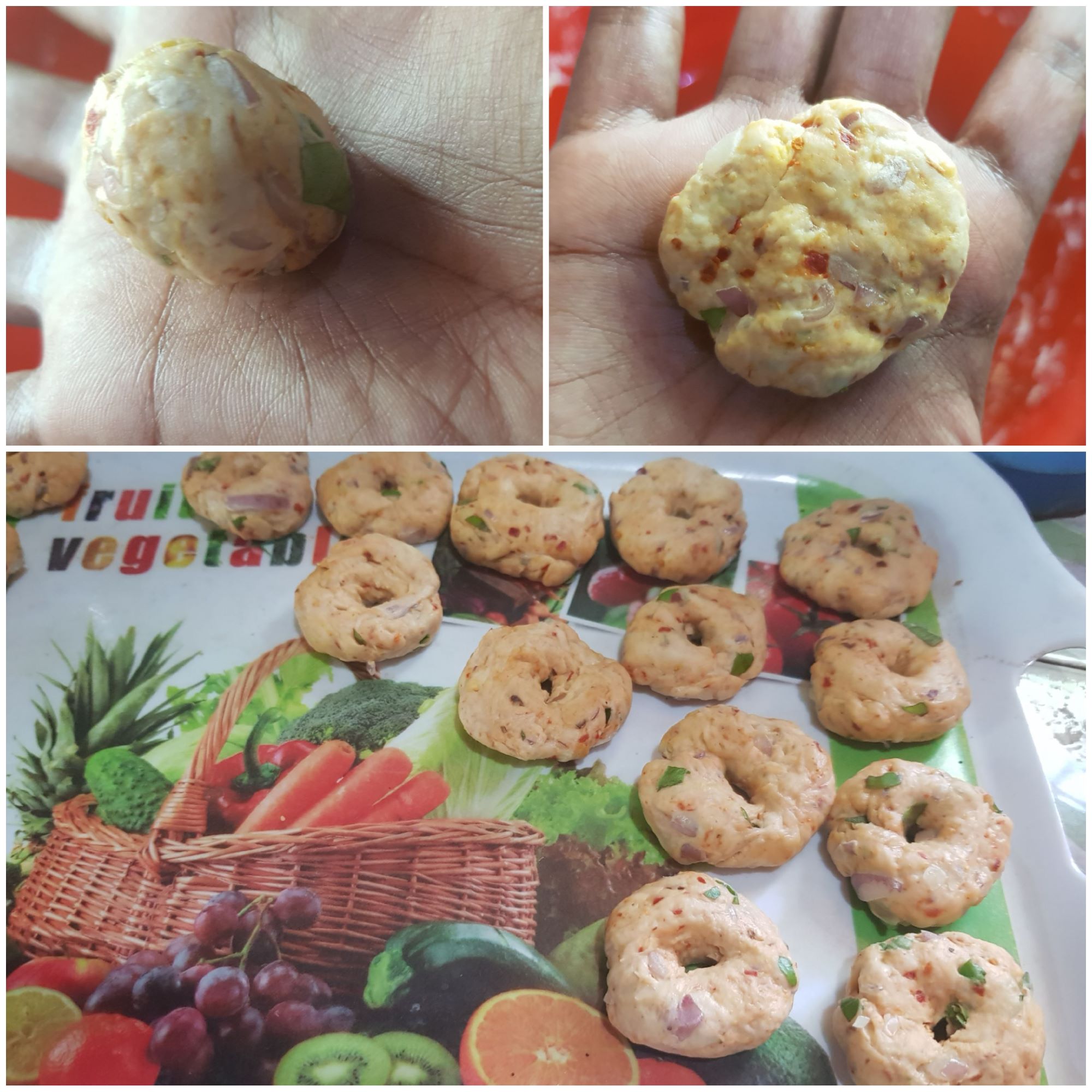 • After that, take small amount of the dough and make a ball. Then flat it and make a hole in the middle.
