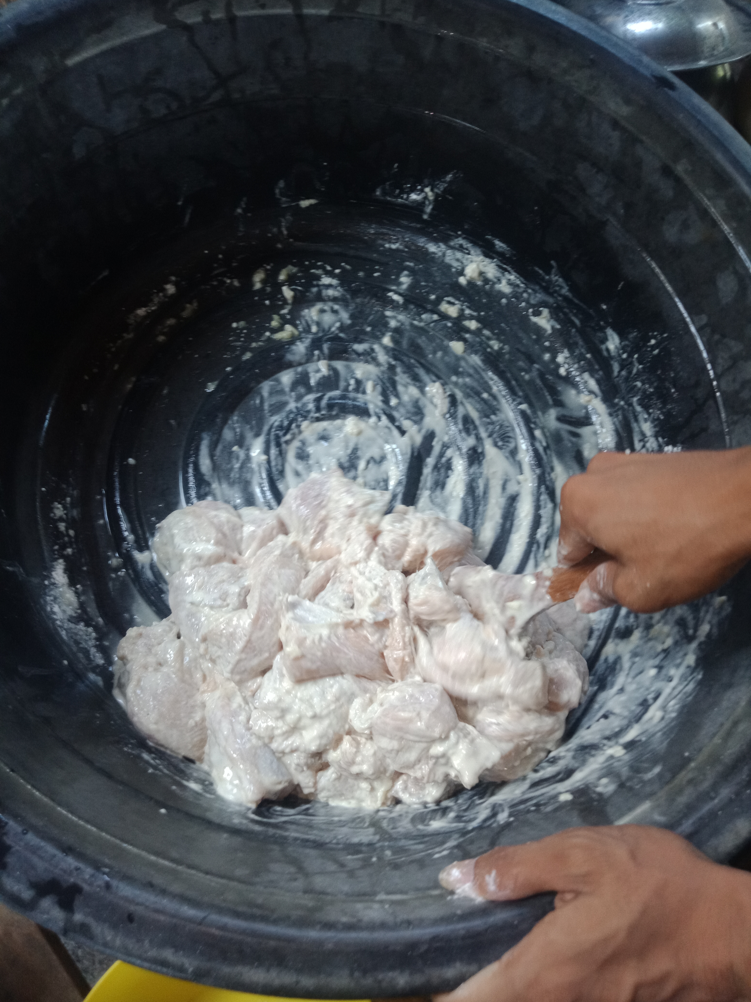 Second step: is to After the chicken has been cleaned, apply some garlic, 3 tablespoon vinegar, 1 teaspoon of salt, and 1/4kilo of flour put in a bowl. After that, combine all the ingredients mix it very well, and then leave it 10mins before cooking and sit aside