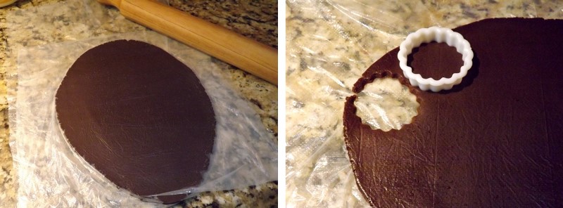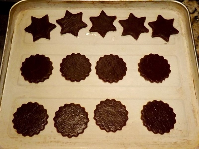 - Pasado el tiempo de reposo se divide la masa y se reserva una parte en la nevera, la otra parte se estira con un rodillo hasta un grosor de 5 mm aproximadamente, yo utilizo el mismo film plástico para no incorporar más harina a la masa. Y cortamos las galletas con el cortador de nuestra preferencia.