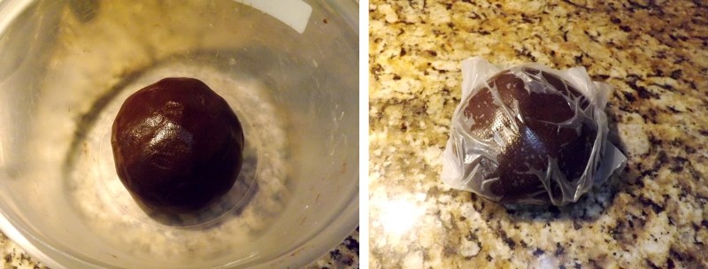 - Se termina de amasar con las manos, se hace una bola con la masa y se envuelve en film plástico y se lleva a reposar a la nevera unos 30 minutos.