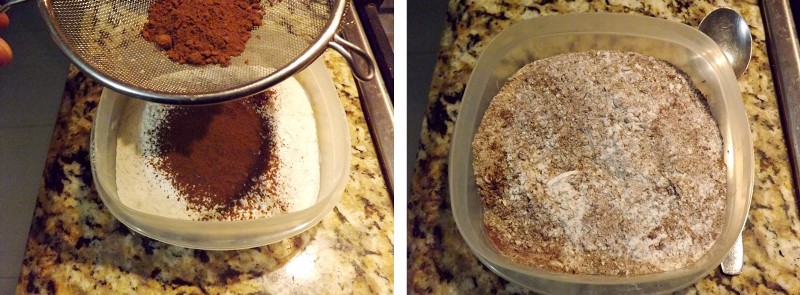 - En un recipiente se tamizan la harina y el cacao, se le añade el bicarbonato y la pizca de sal y se mezclan los ingredientes.