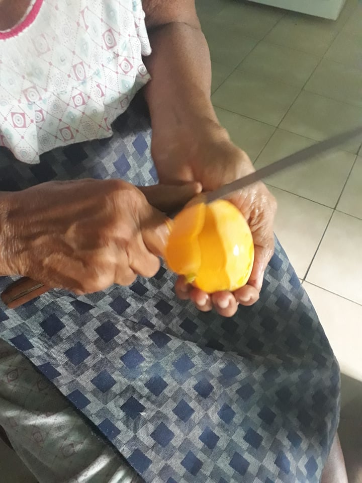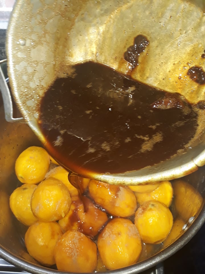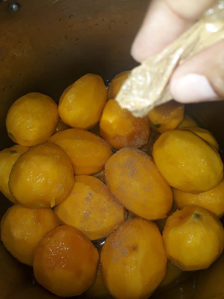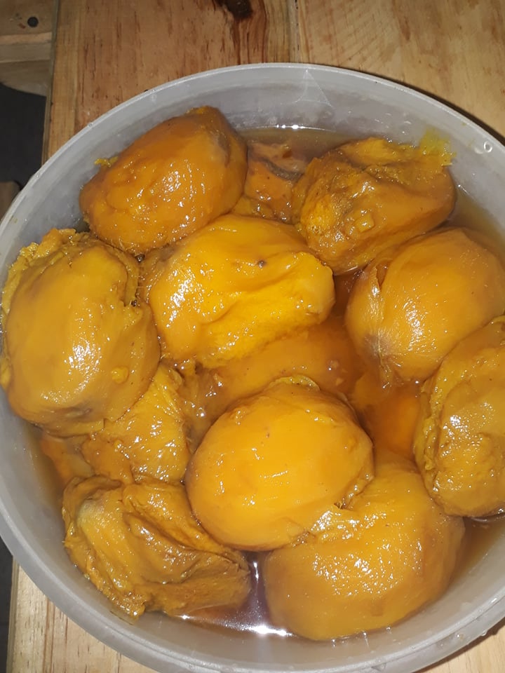 Se seleccionan los mangos, observando que no estén aguaditos, se lavan y se pelan, se vuelven a lavar, los colocamos en una olla, los llevamos a la cocina a fuego lento, se agrega el azúcar o el papelón ya derretido si es necesario se le agrega dos vasos de agua, cuando estén hirviendo se le agregan las especies, se dejan cocinar tapados por hora y media, dejamos reposar y llevamos al refrigerador para degustarlos bien fríos.