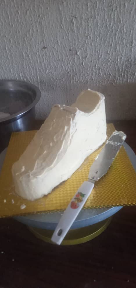 Add the butter(add the butter gradually because if you add it once it will be difficult to stir) and the icing into a bowl and stir it well untill it produces a foamy like paste. Add two spoons of vanilla extract, milk and stir properly. Trim down the cake into the desired shape you want it to be. I want my cake to be in shoe like shape so I have to trim it to that shape.