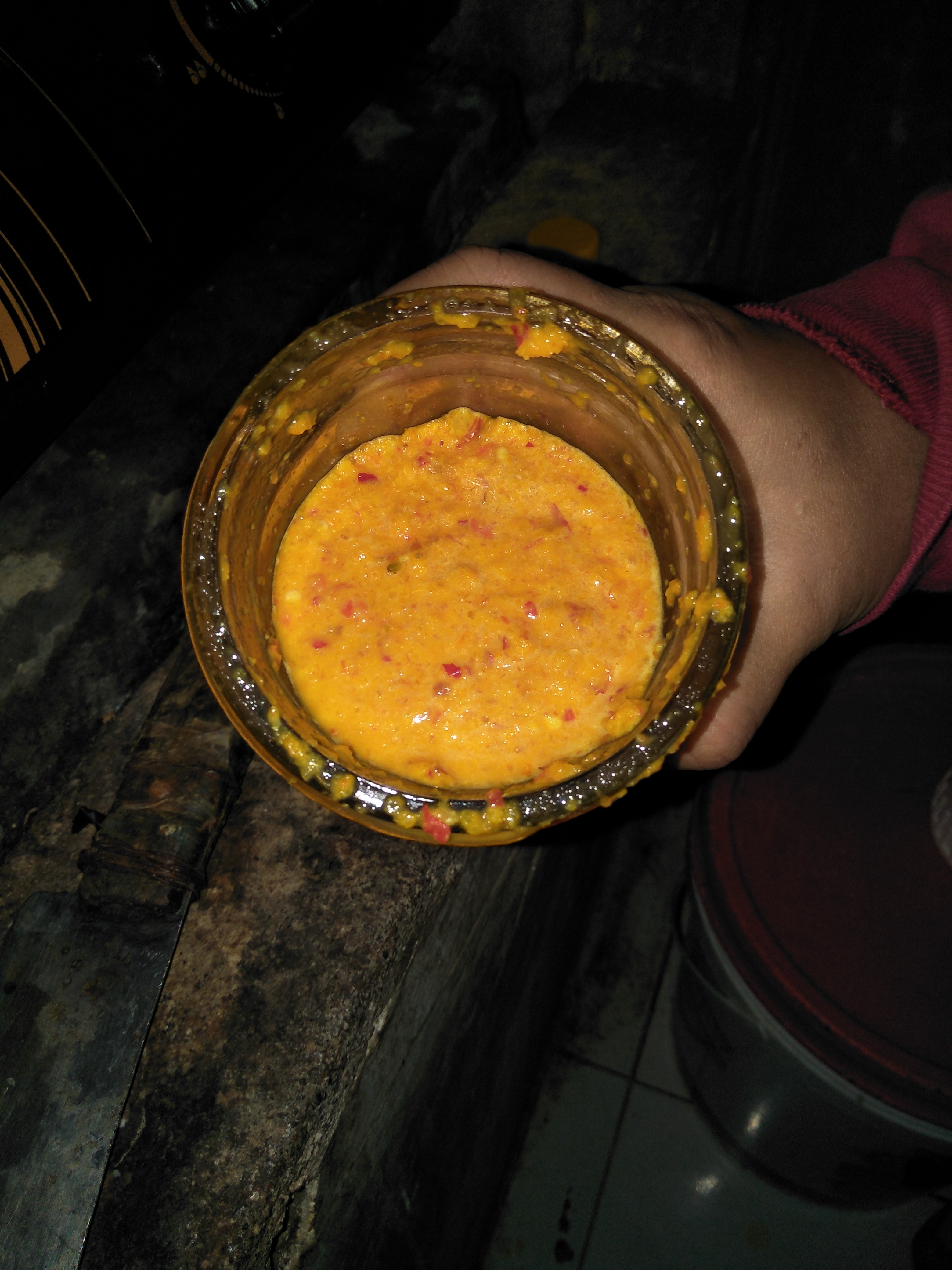 - Haluskan bumbu yang terdiri dari bawang merah, bawang putih, cabe, kemiri dan kunyit.