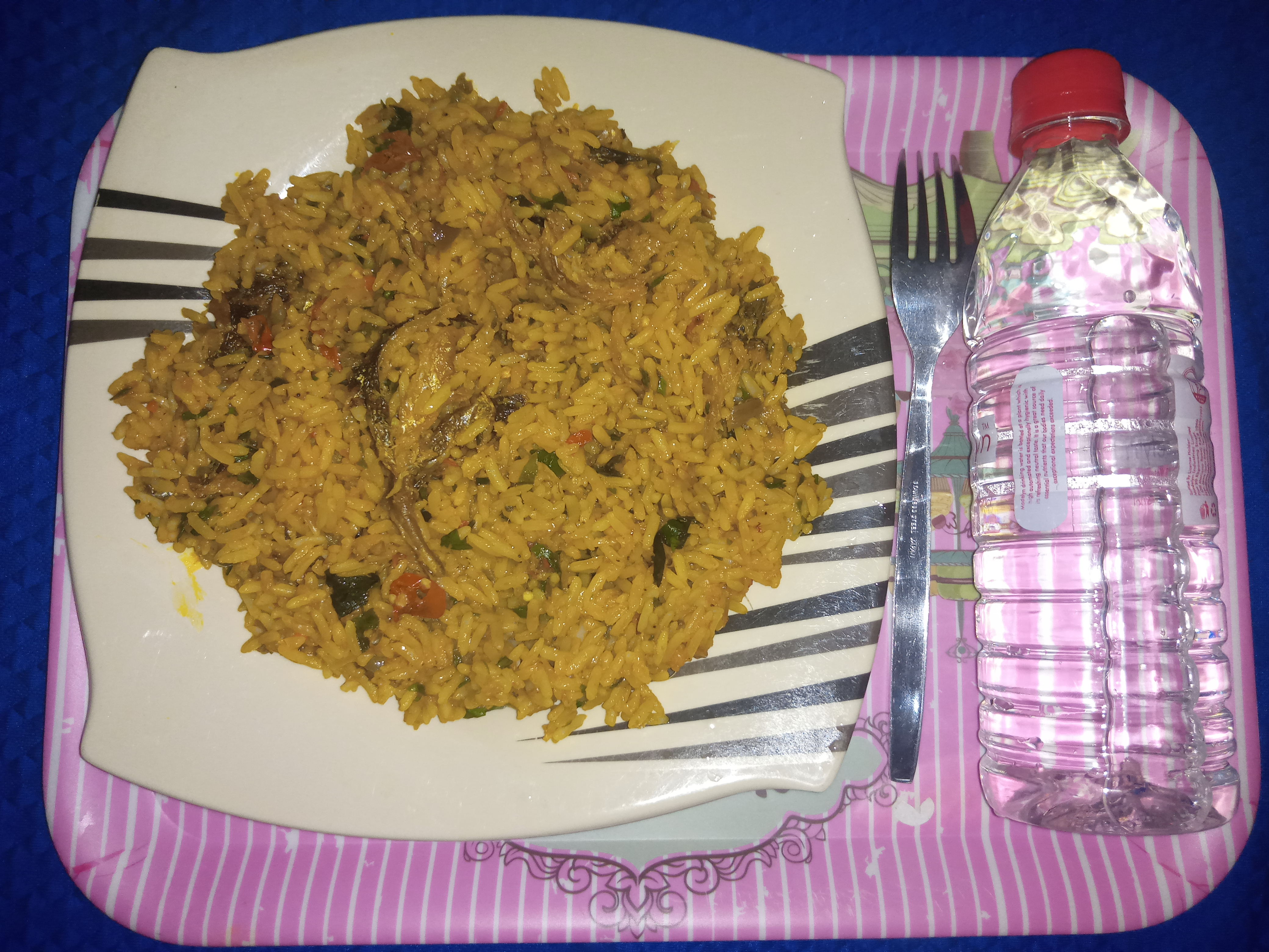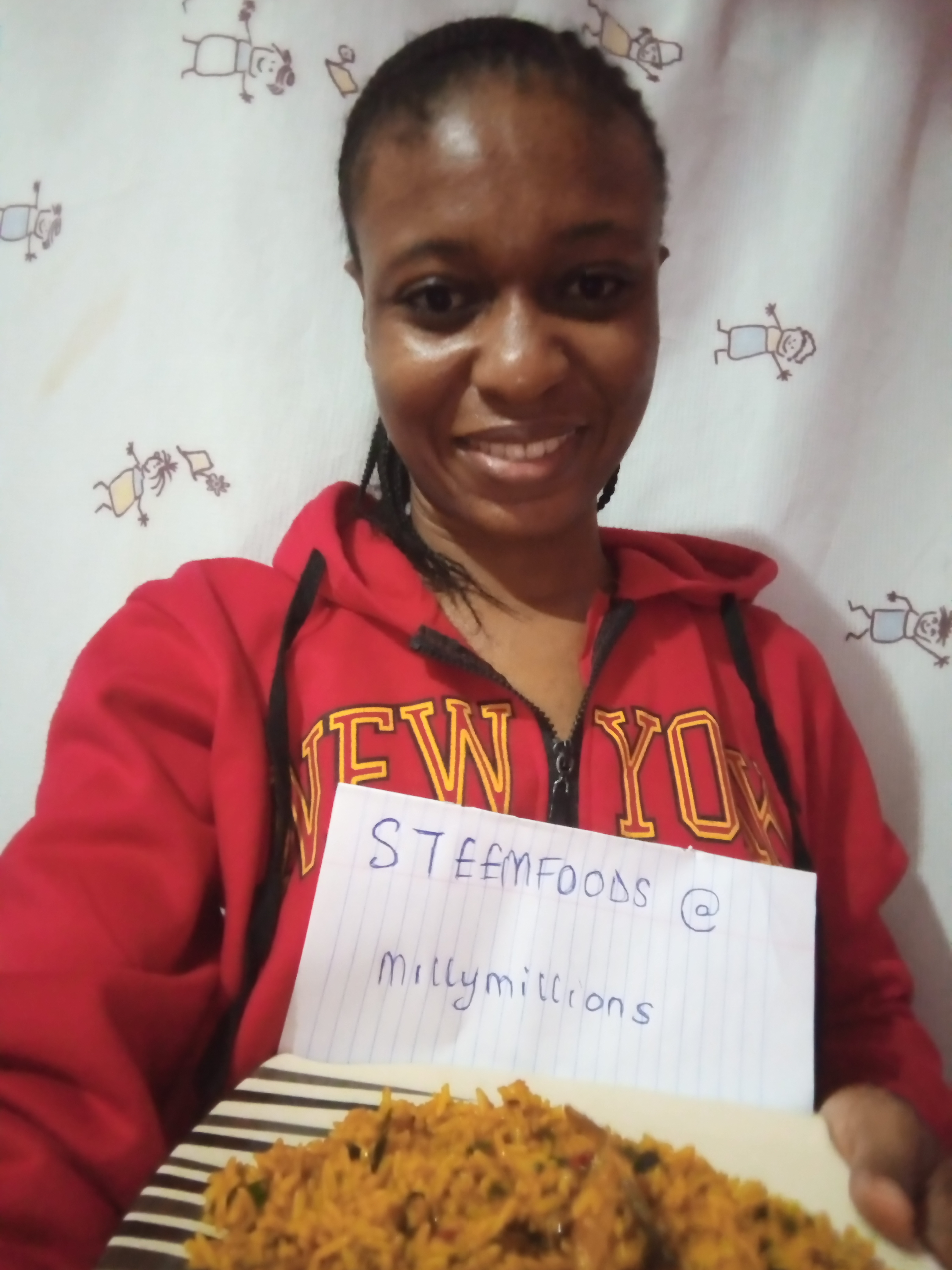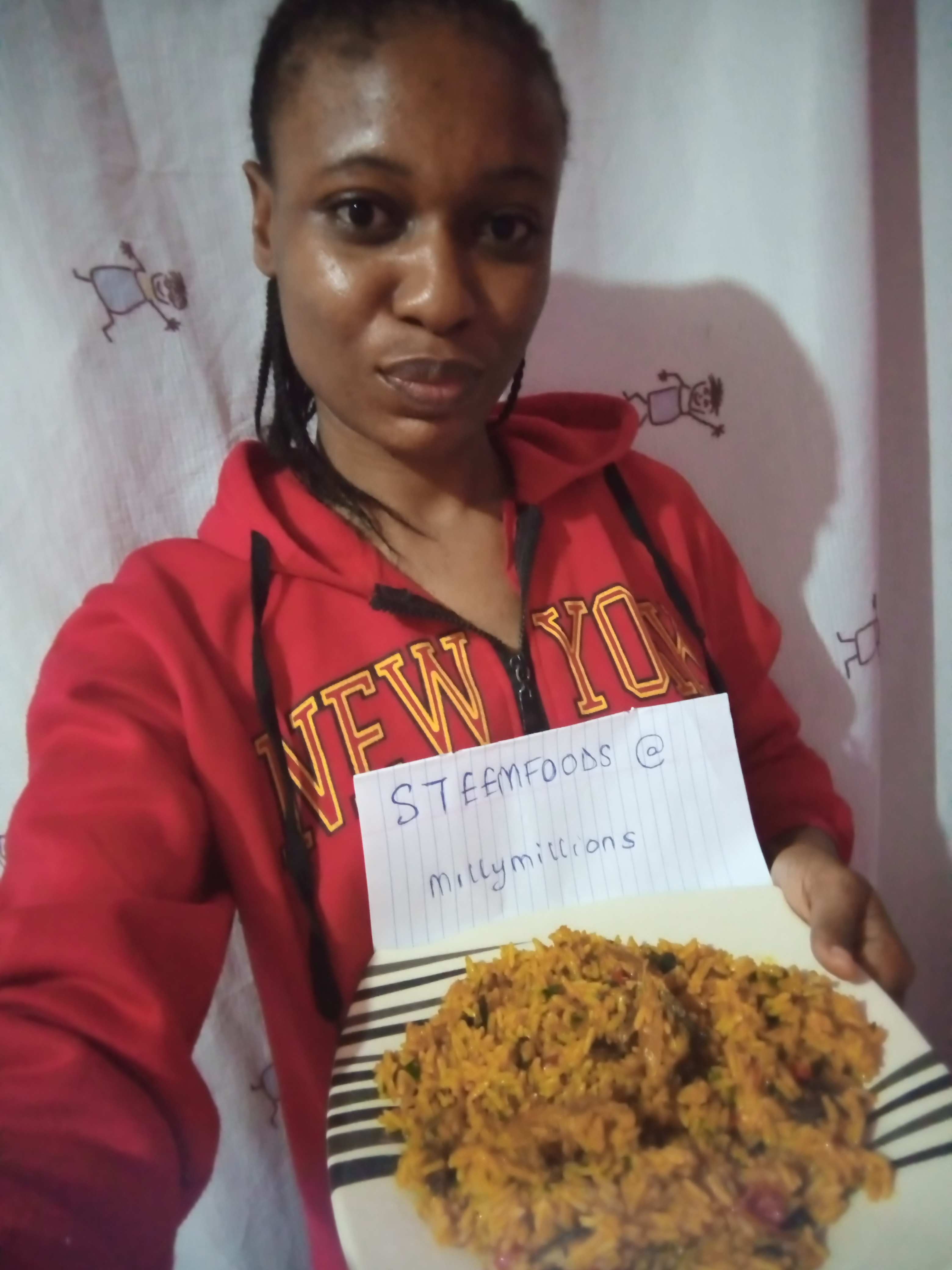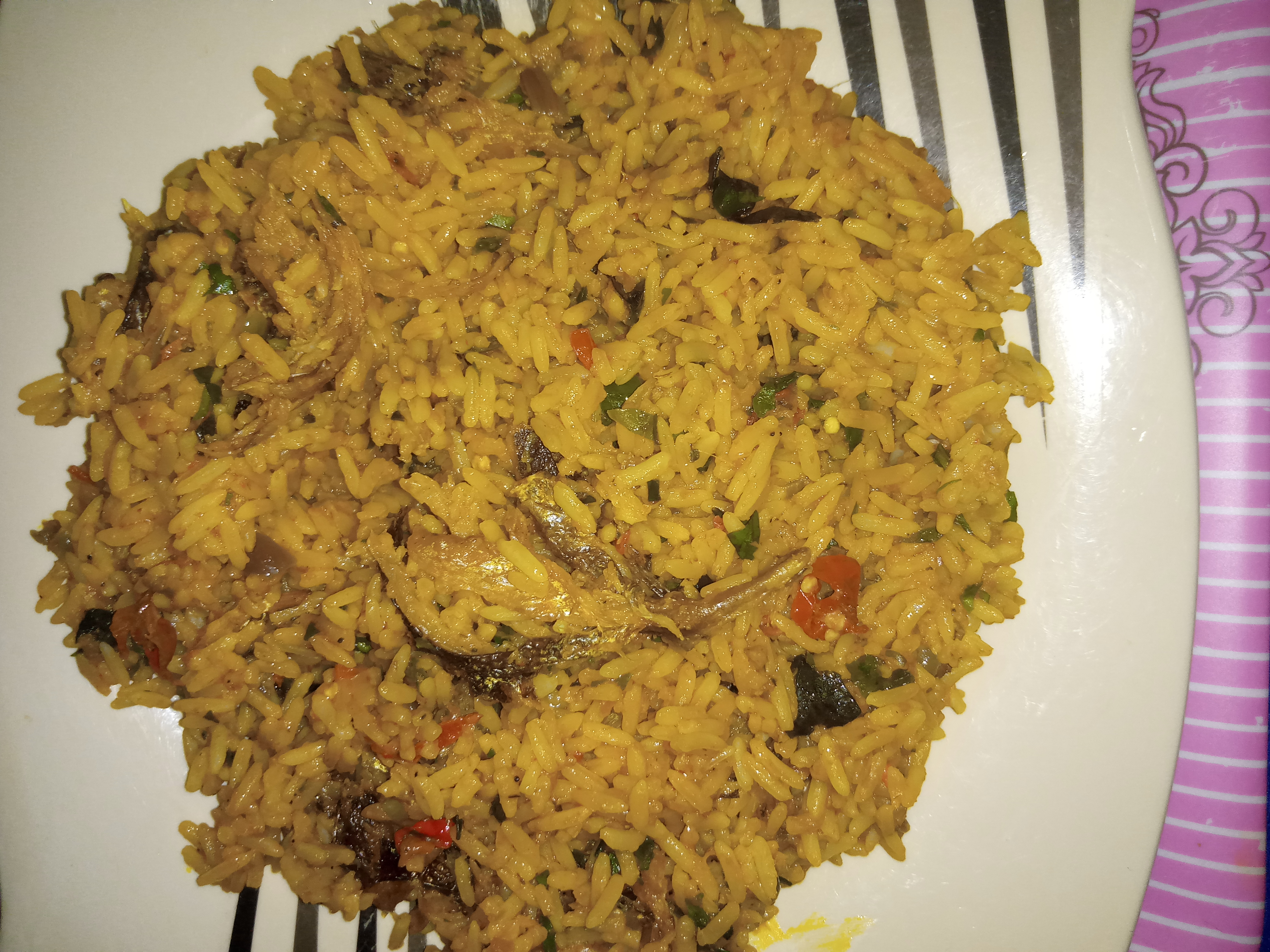 So Nigerian rice is served! It looks delicious right? Yeah,you should make this palm oil rice one of this days. You can have it with water,juice, fried plantain(ripe or unripe),Banana,etc.
