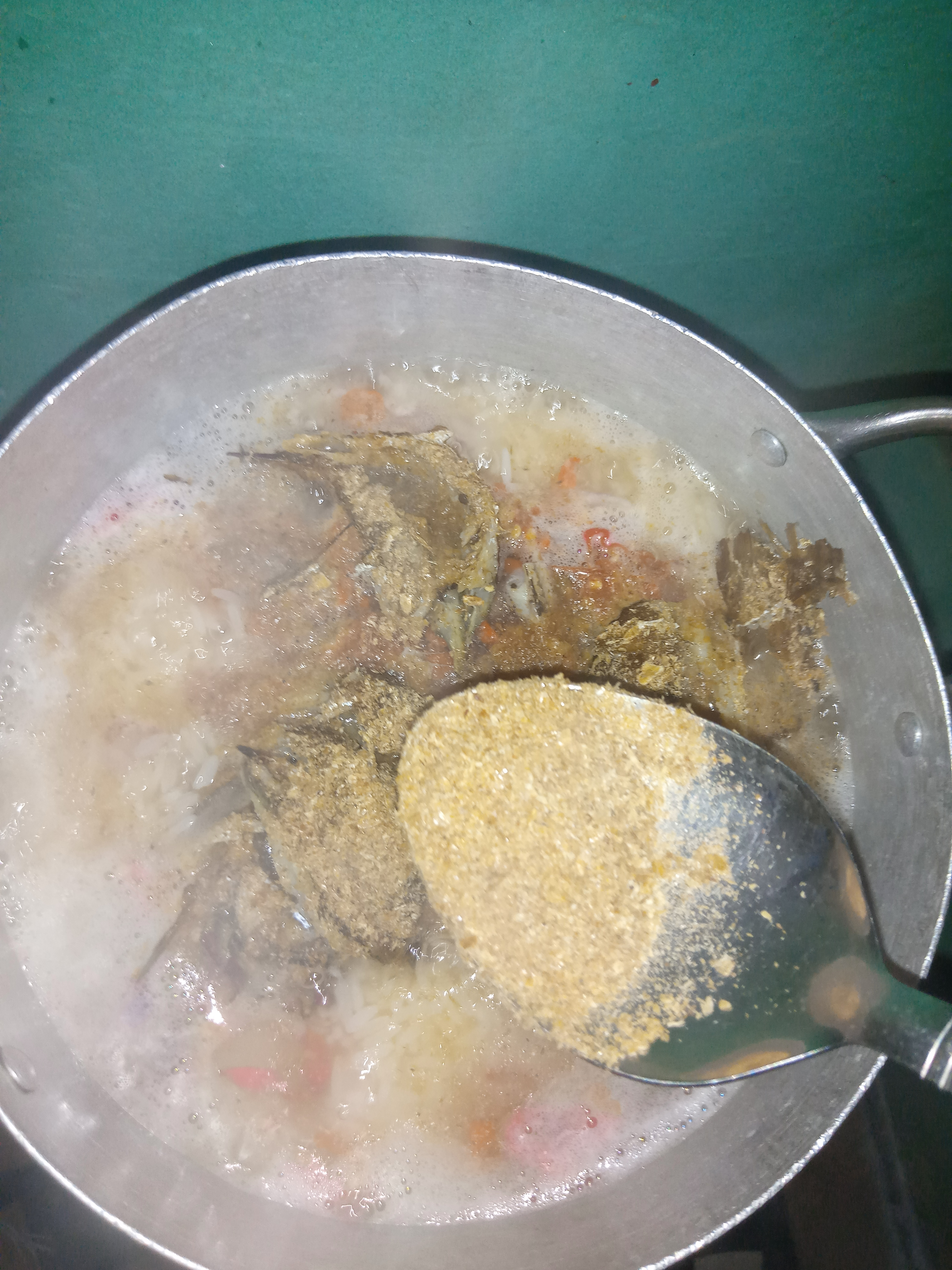 Step 3: add onion,pepper,fish,crayfish and seasoning cubes and turn it all over withh a spoon so the ingredients can settle and let it for 3mins.