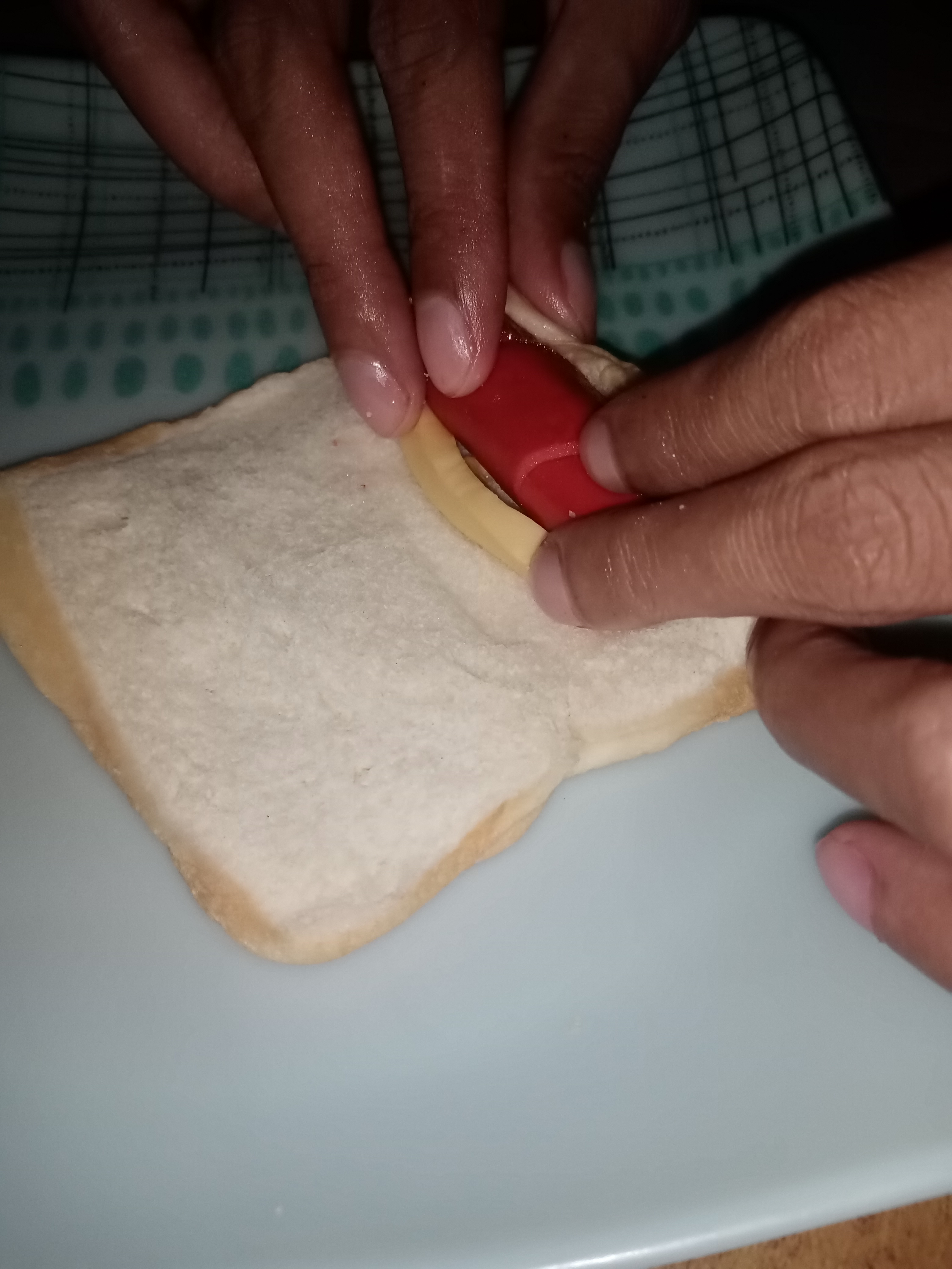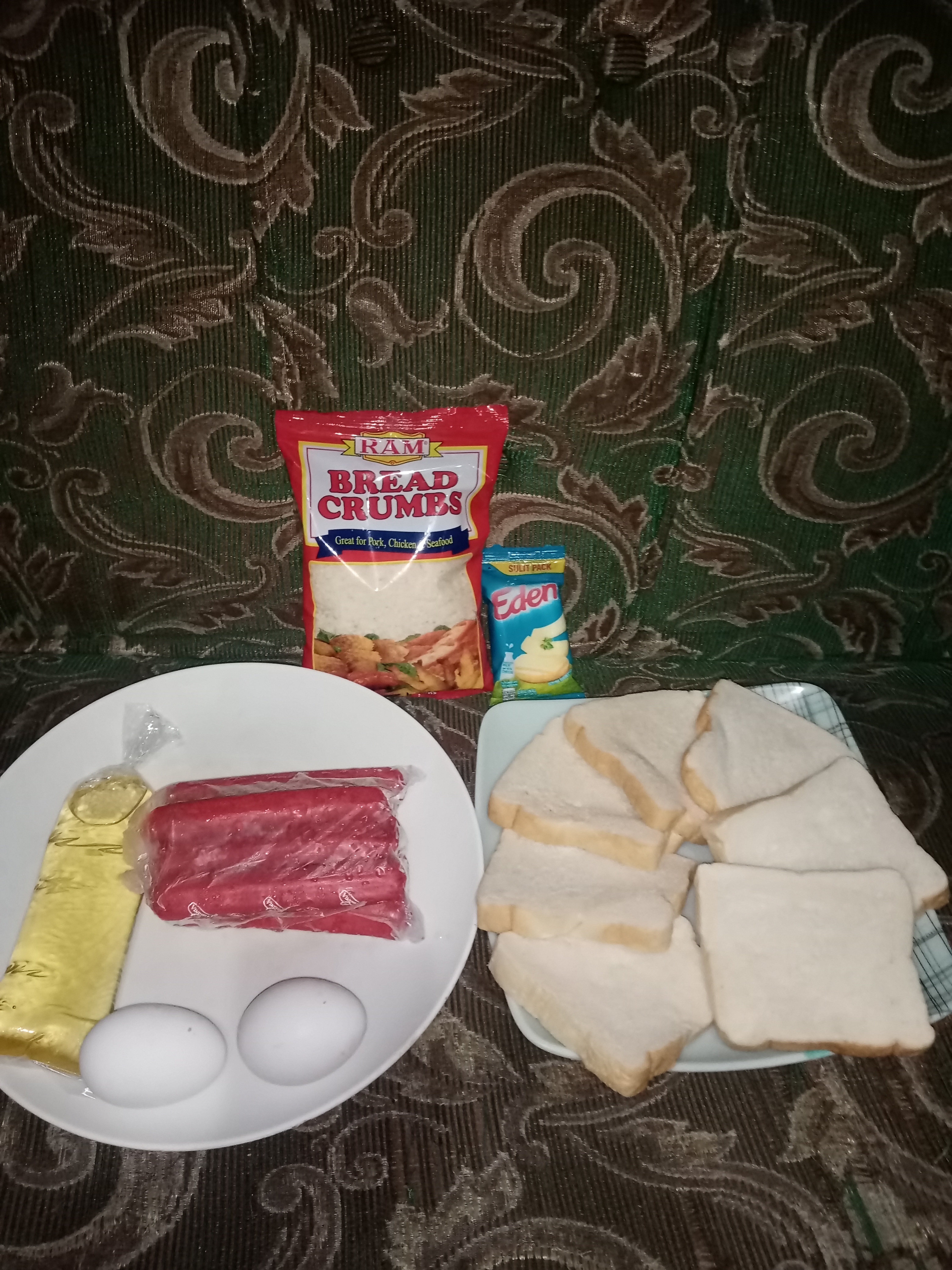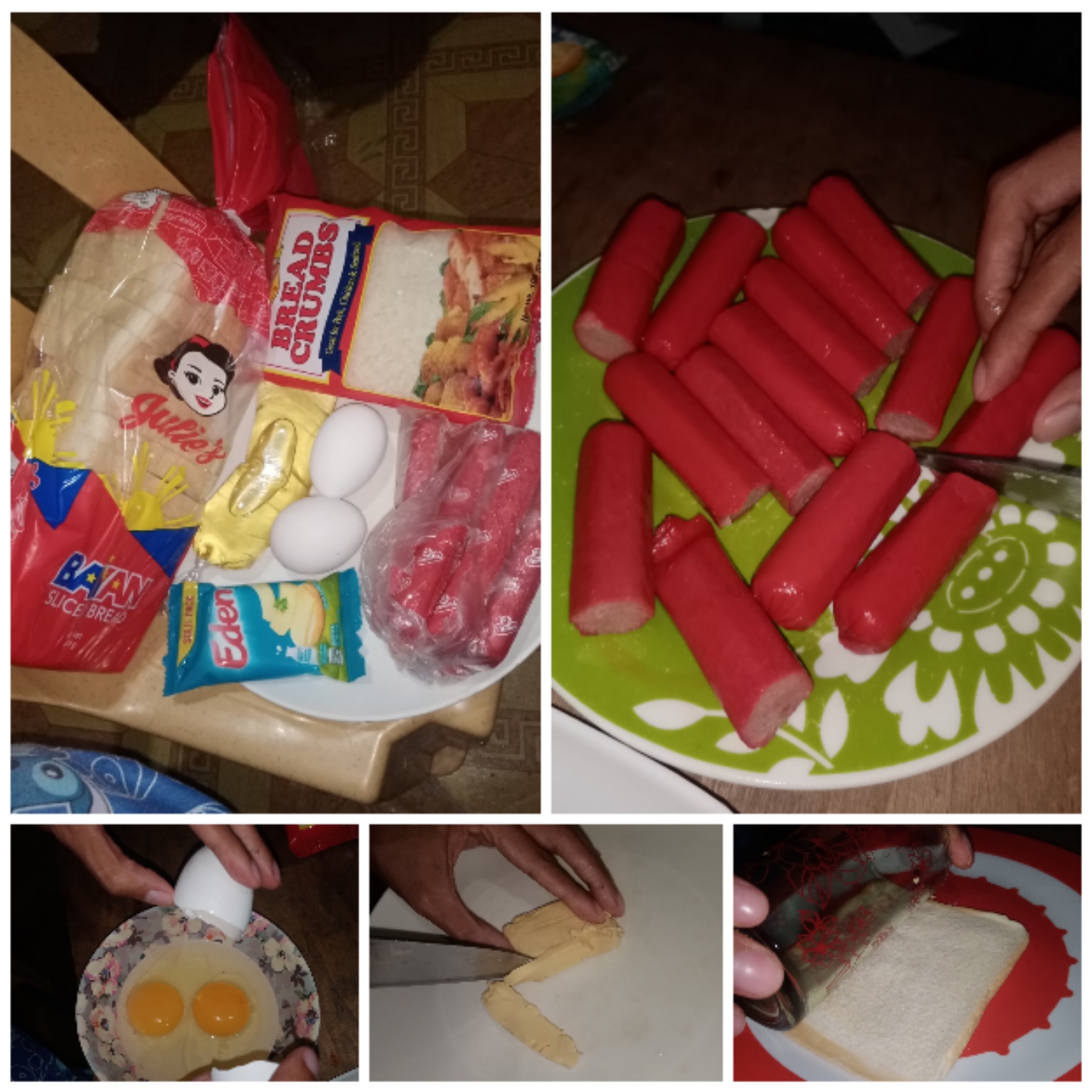 •Prepare the needed ingredients and tools to be used. First, cut the hotdogs in half to create more hotdogs. Second, mix the two eggs. Third, cut the cheese into strips. And fourth, flatten the bread through a roller but in here we use a glass cup as an alternative for a bread roller.