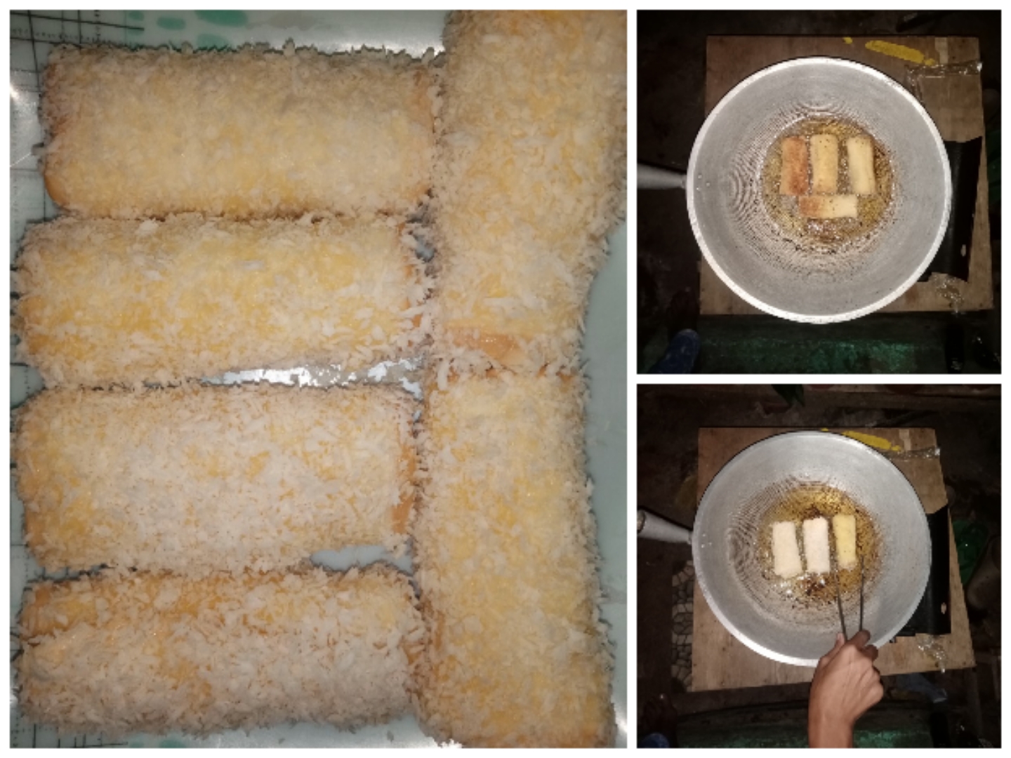 •With the same oil used in frying the hotdogs, cook the finished rolled bread. Turn the bread when the other side turns into golden brown. And if it is completely cooked, kill the heat and get the hotdog rolls.