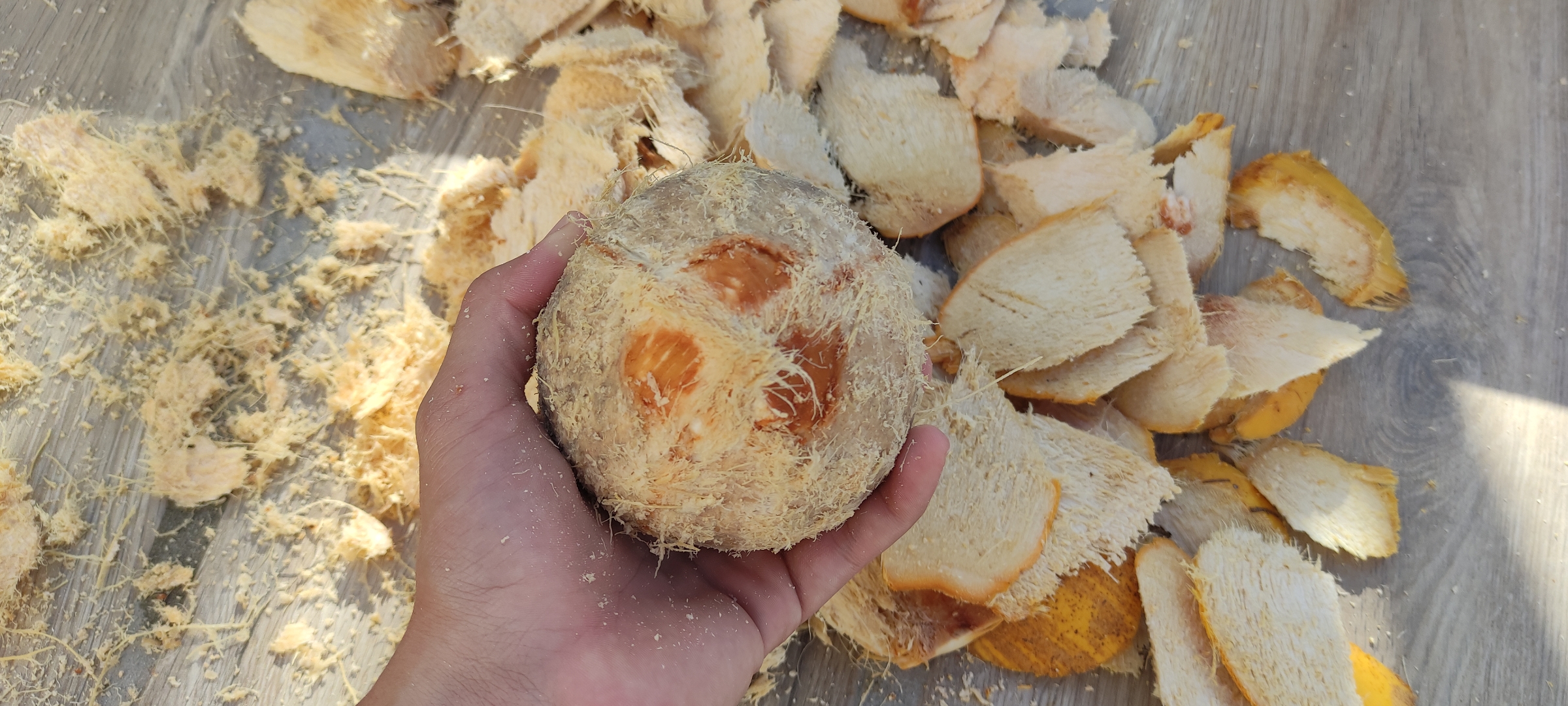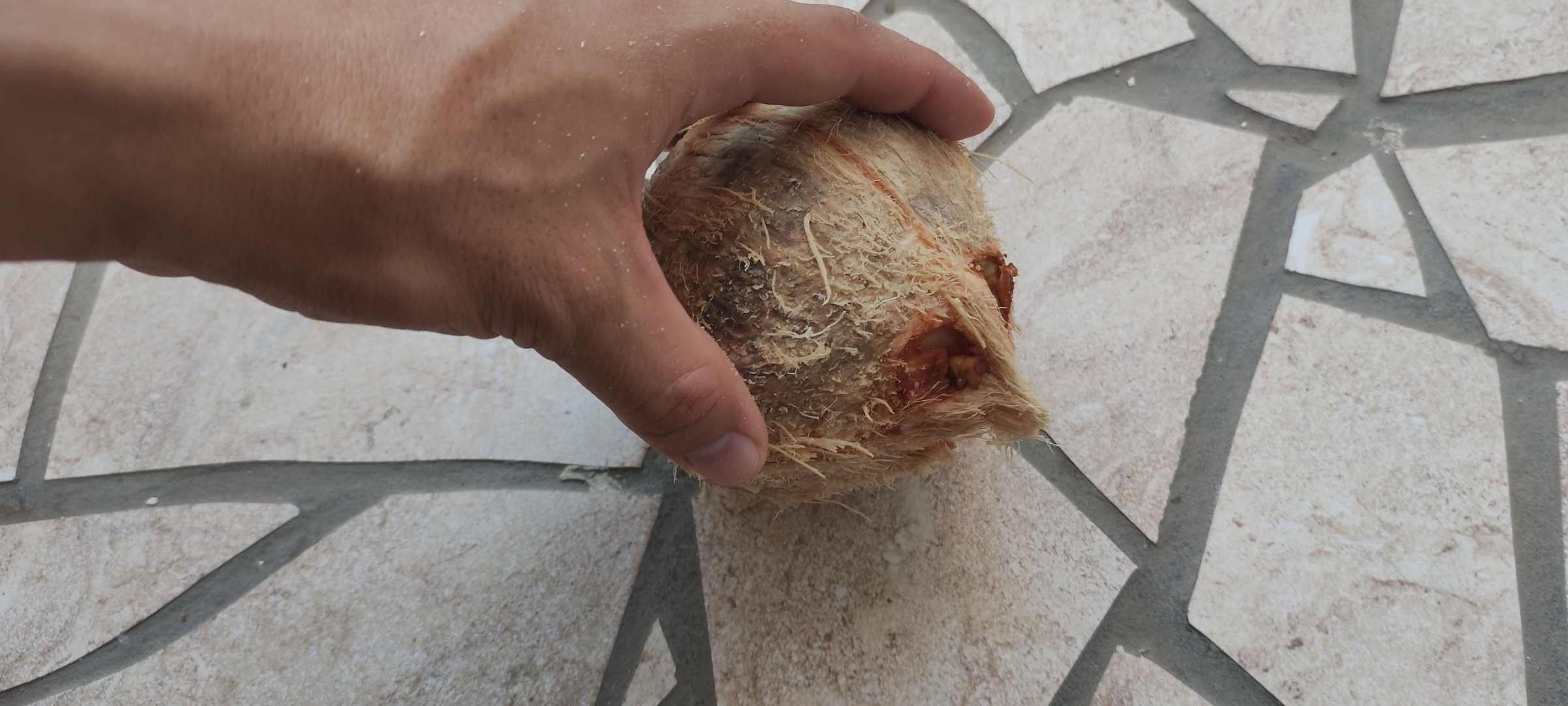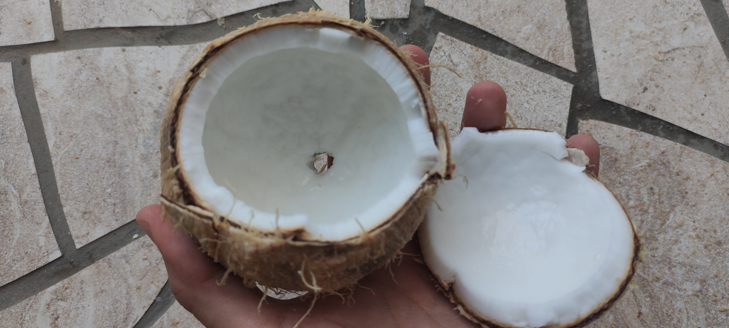 Ahora lo que haremos será buscar conseguir la carne del coco, la cual terminara de dar esa textura increible, lo golpeé contra el piso hasta quebrarlo