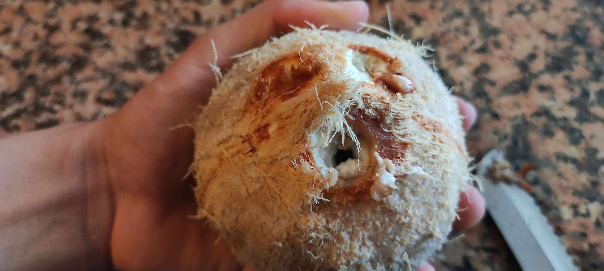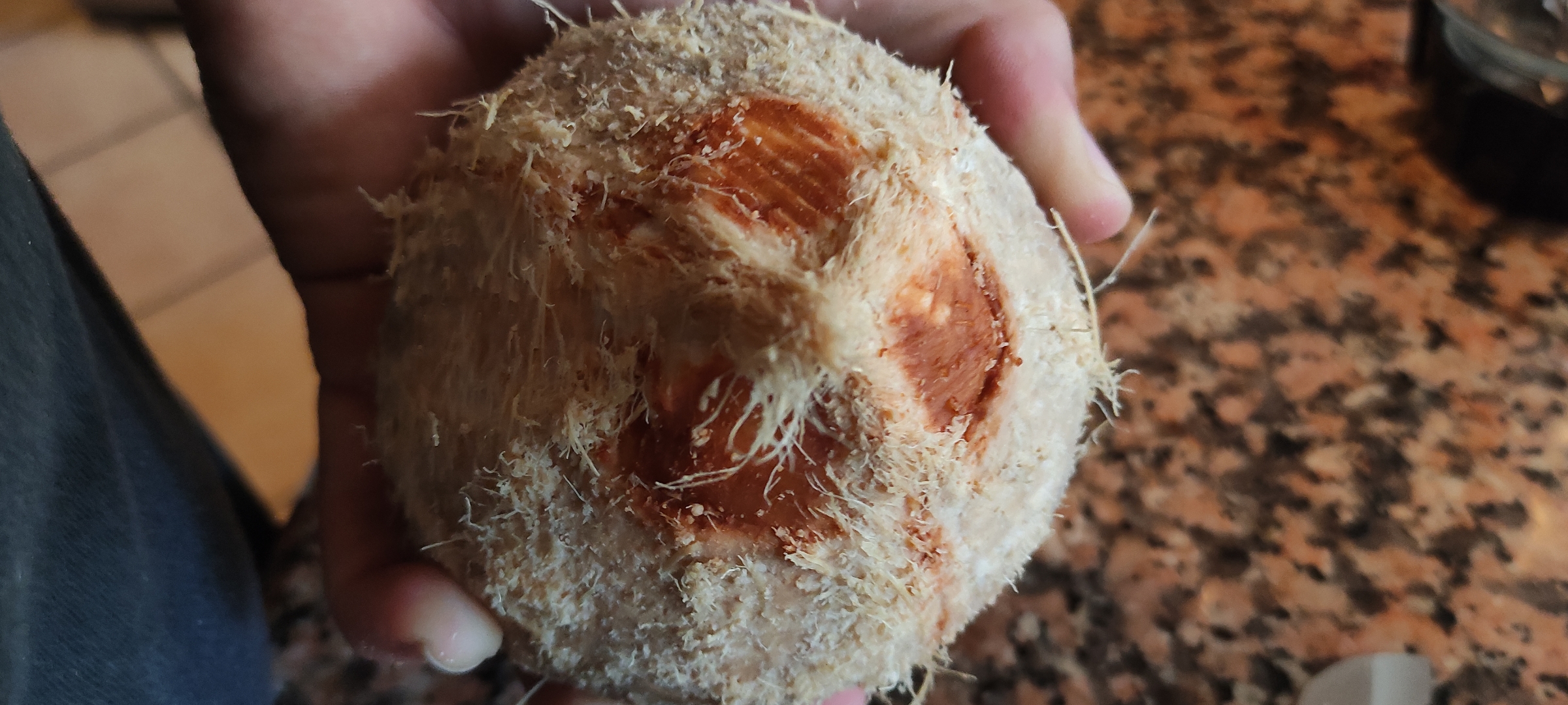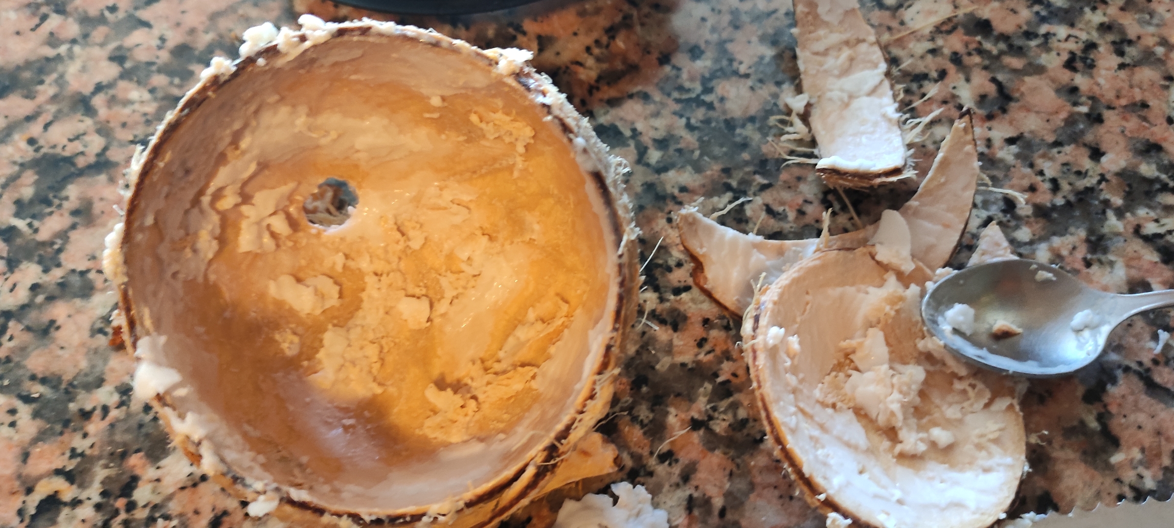 Ahora lo que haremos será buscar conseguir la carne del coco, la cual terminara de dar esa textura increible, lo golpeé contra el piso hasta quebrarlo
