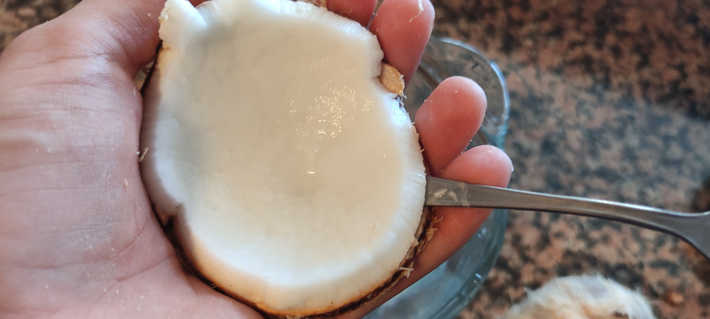 Ahora esa carne la tendremos que sacar, depende del tiempo del coco, sera mas dura o no de sacar, en este caso usé una cuchara para sacarla