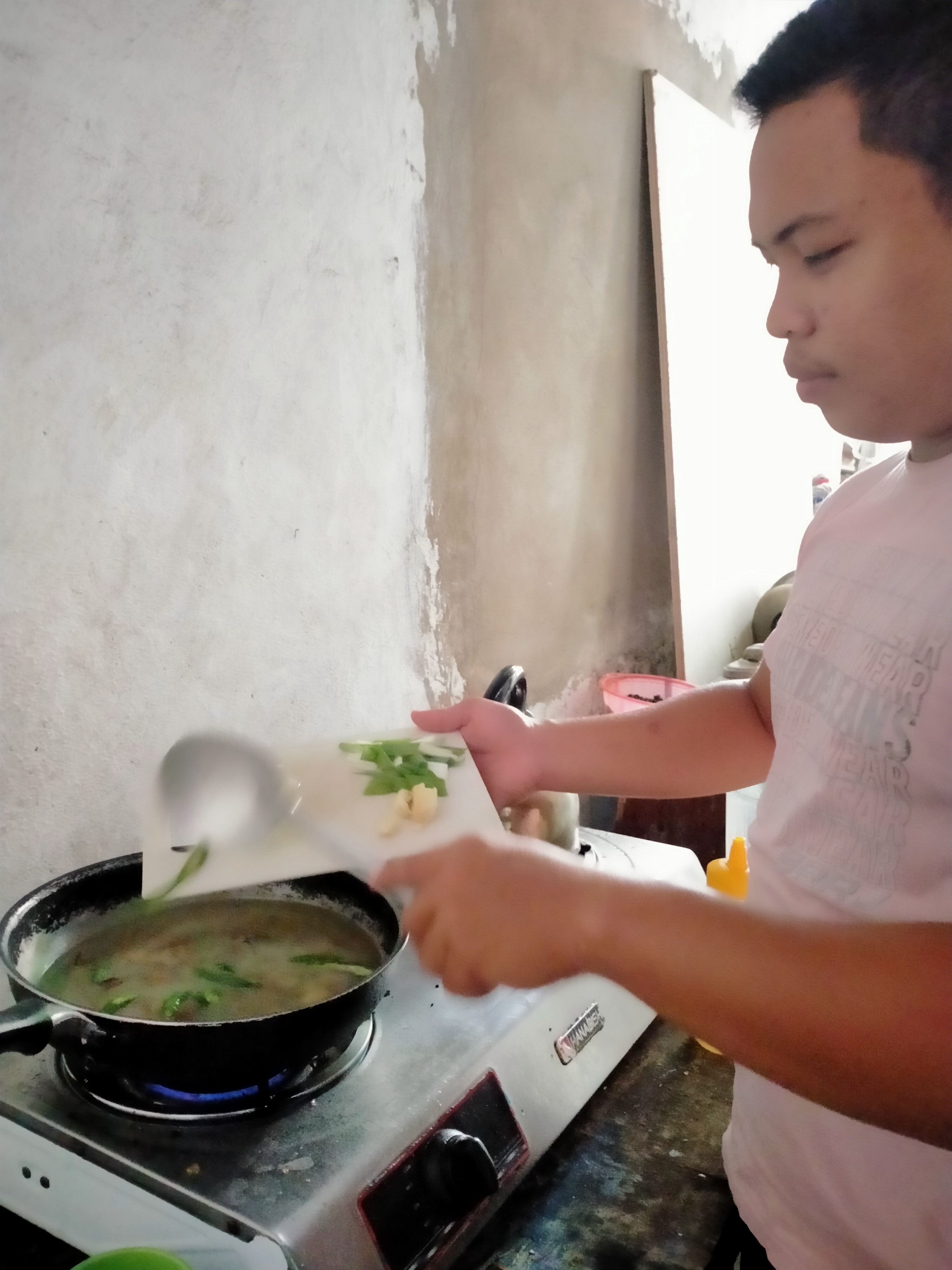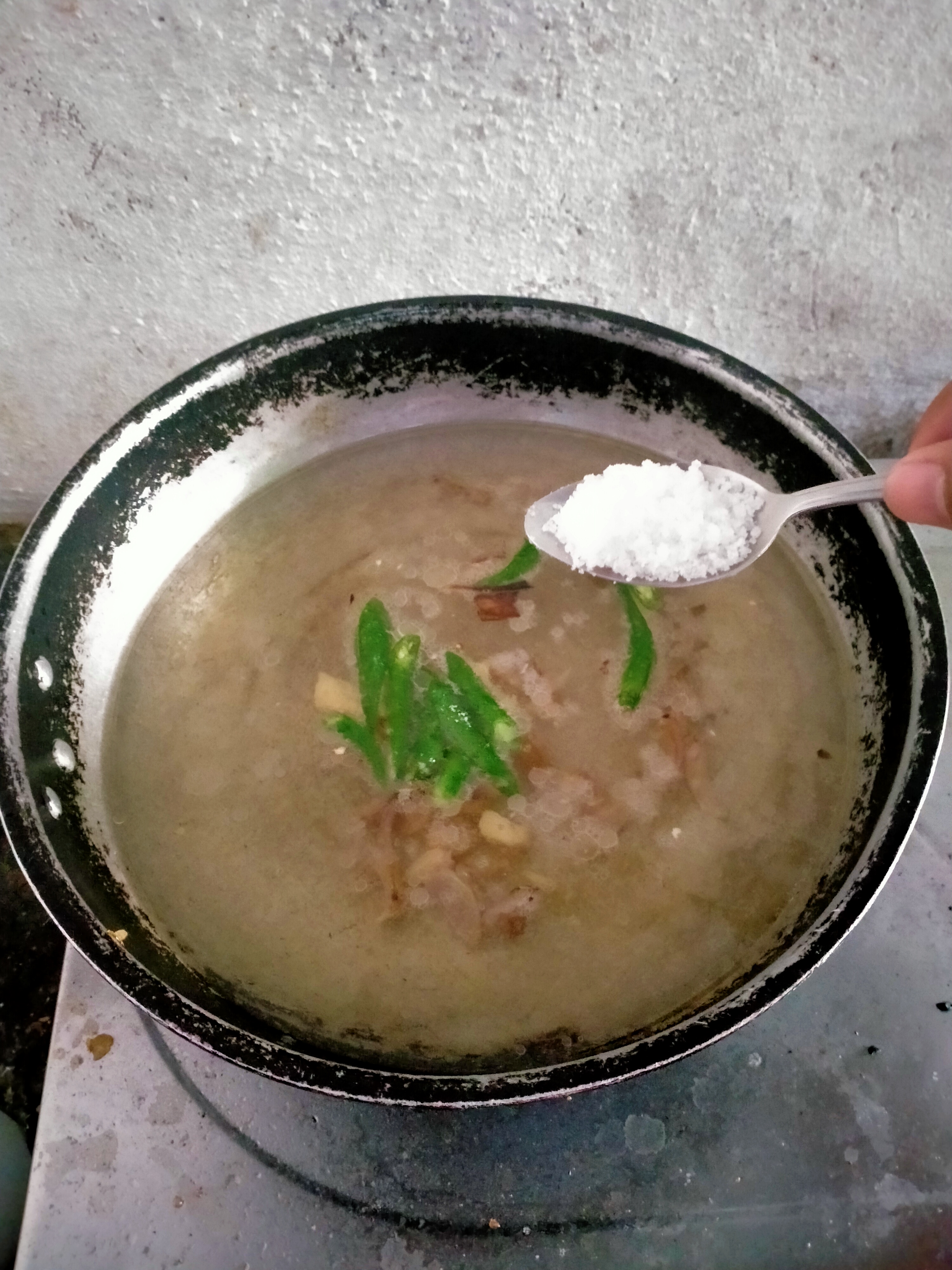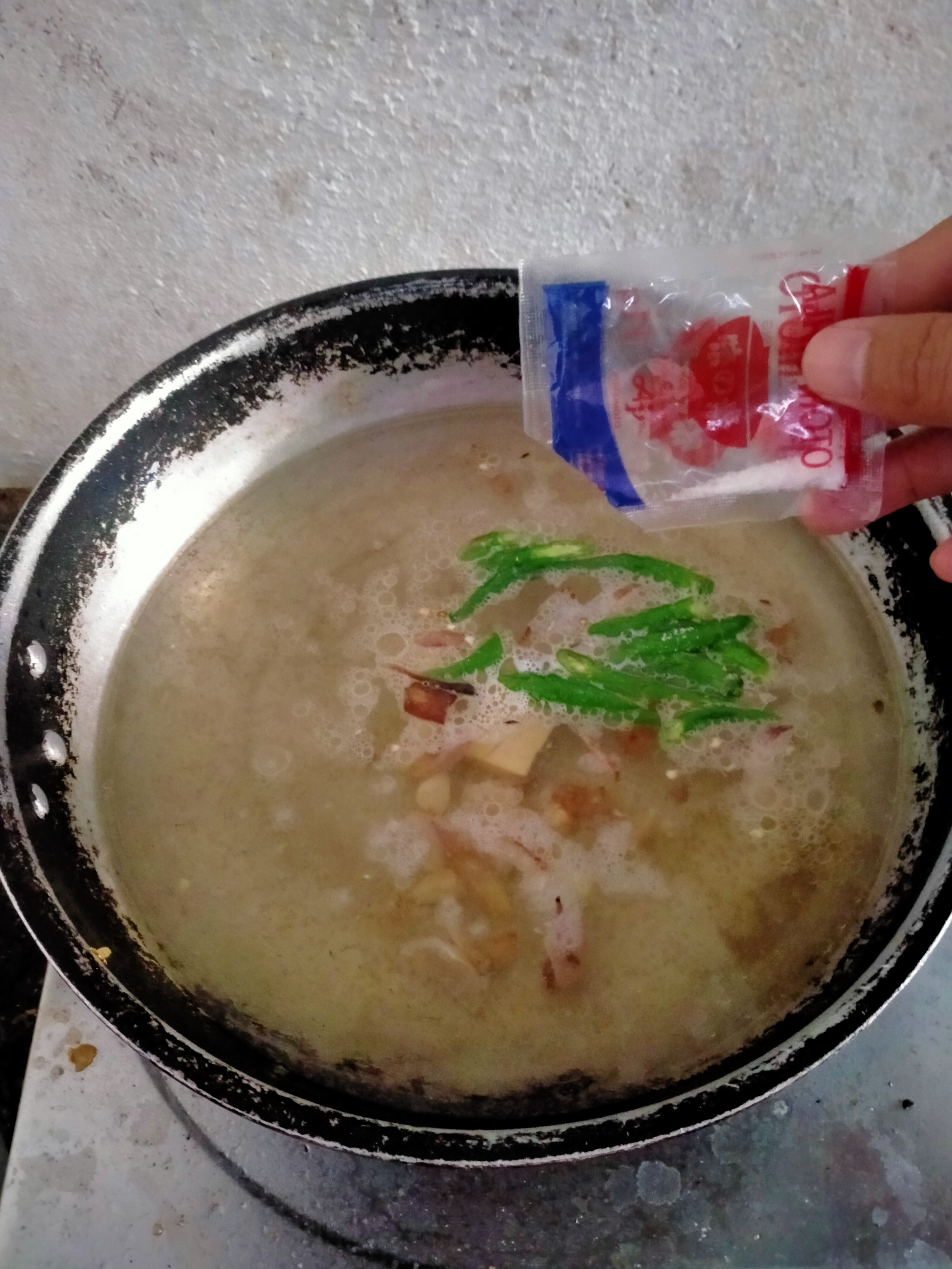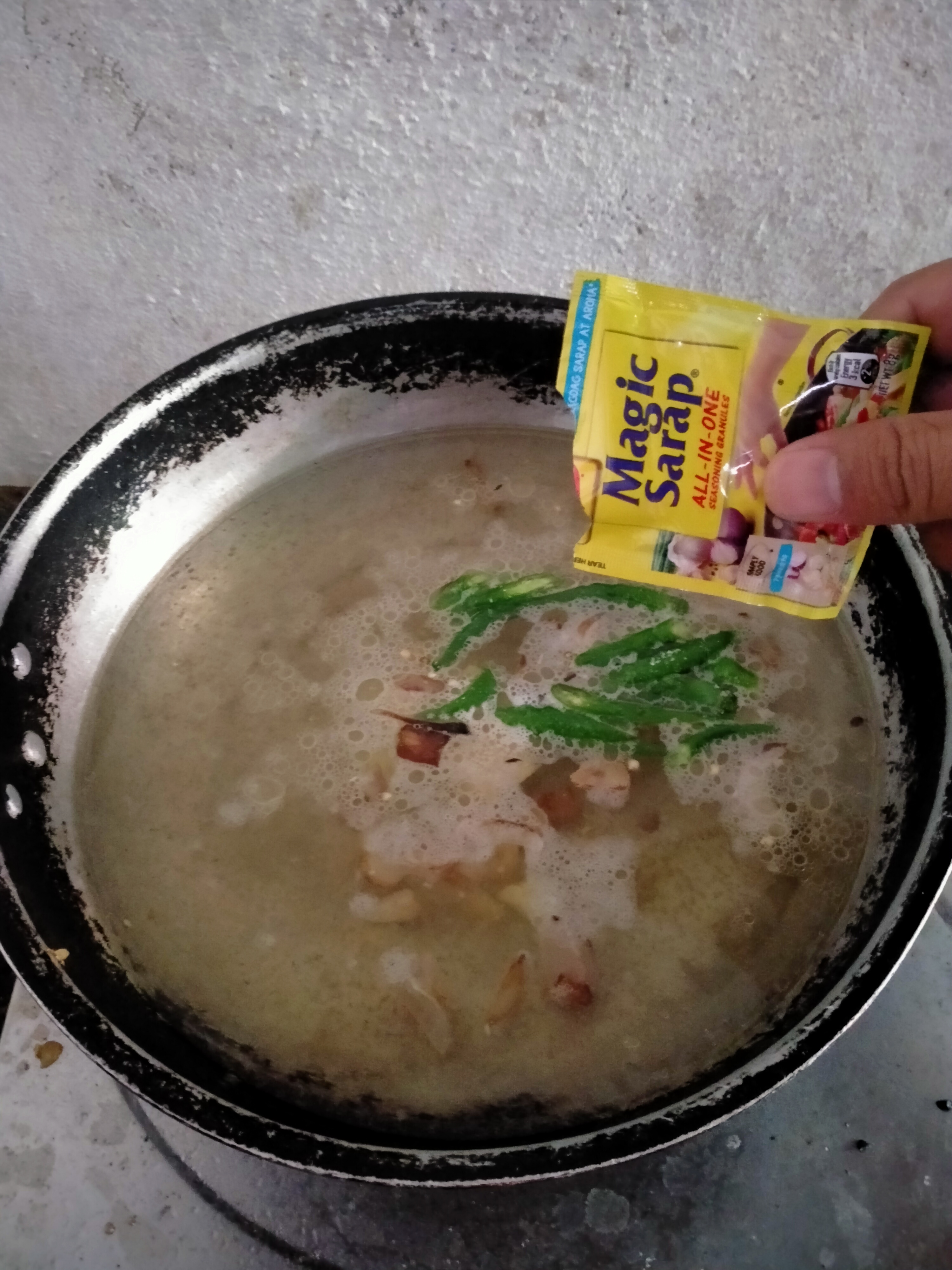 - Next, when the broth already boils, put 1 tablespoon of salt, 1/4 of sachet of ajinomoto or MSG and a half sachet of magic sarap to add flavor. Mix them and cover the pot to dissolve the mixture.
