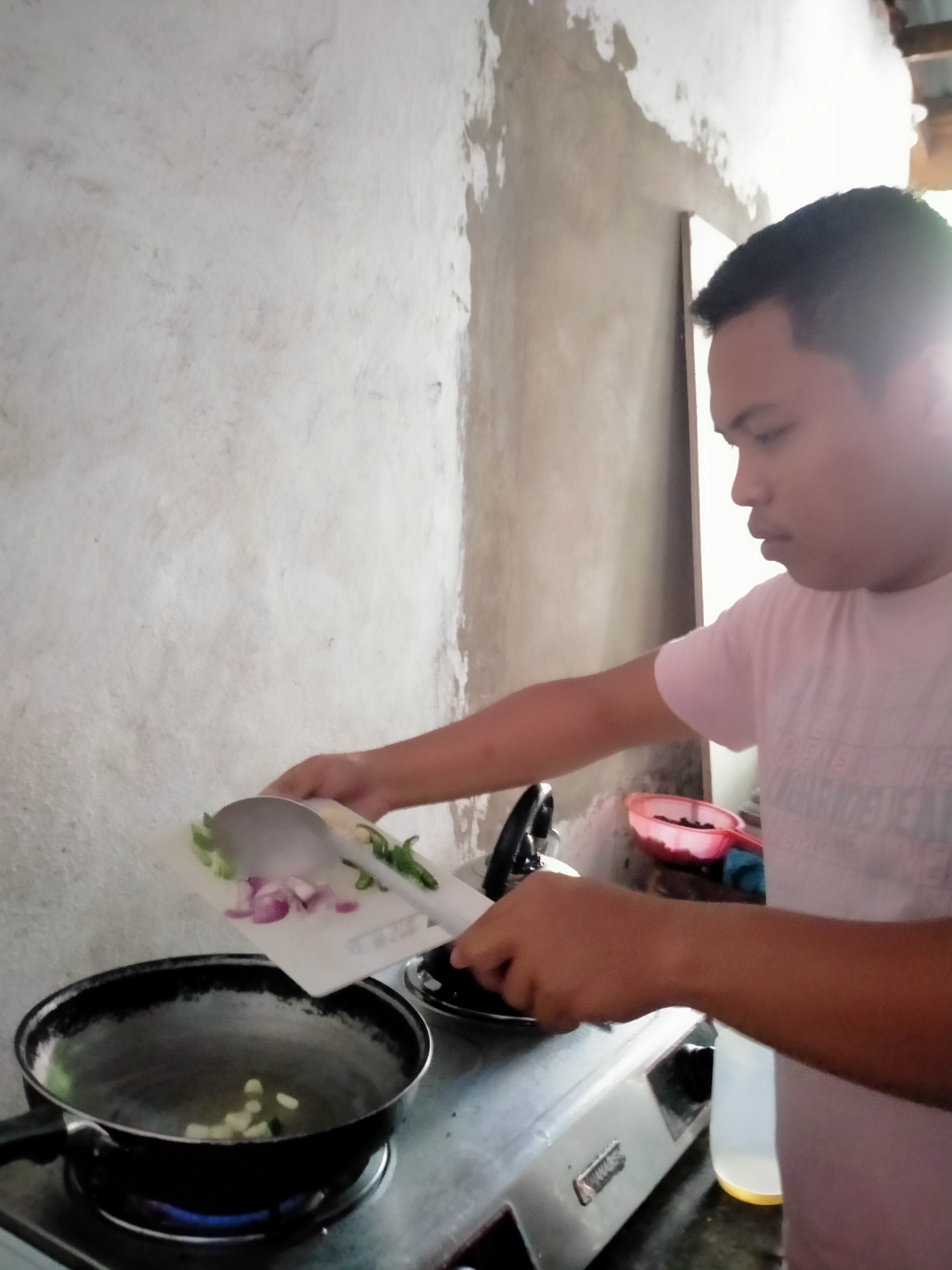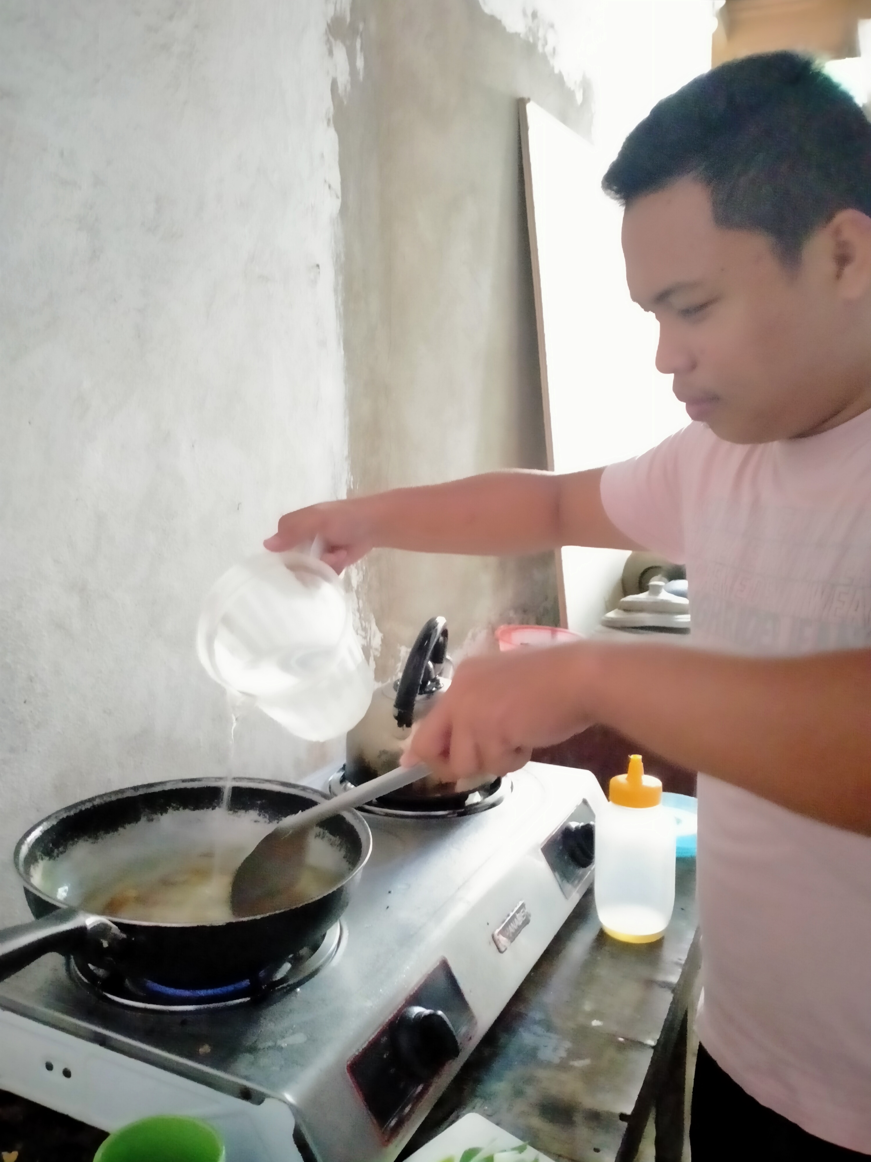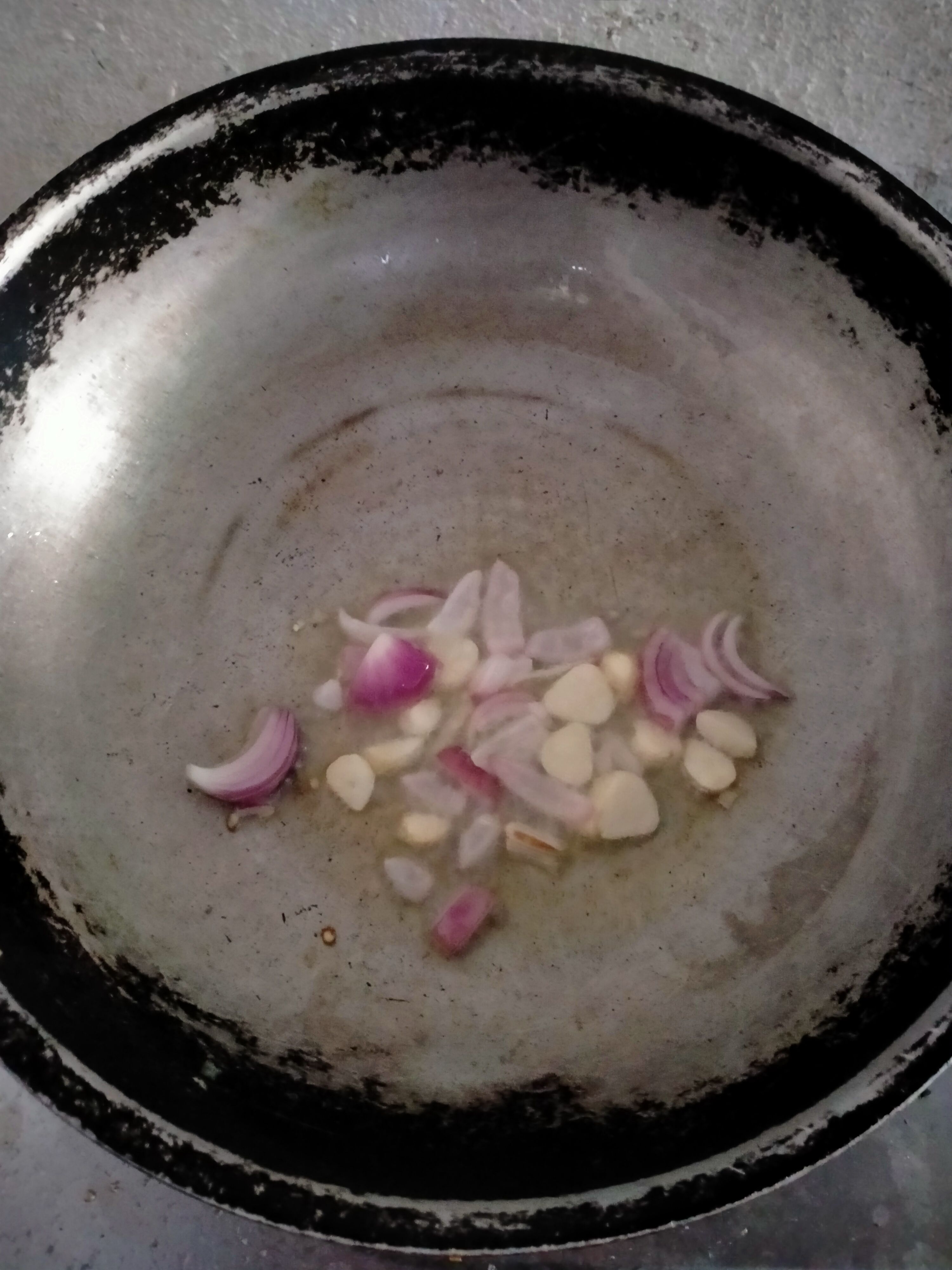 - Heat the oil on the pot and wait for 30 seconds to 1 minute to add the garlic and onion. Saute the garlic and onion until it smells aromatic.