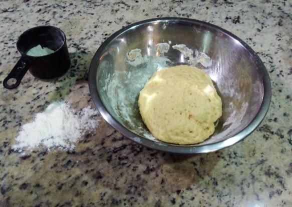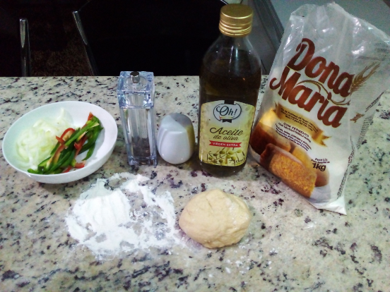 1.- Preparamos la levadura instantánea con el agua y cuando esté lista amasamos la harina con una pizca de sal y el azúcar más el agua. Lo dejamos reposar al menos una hora.