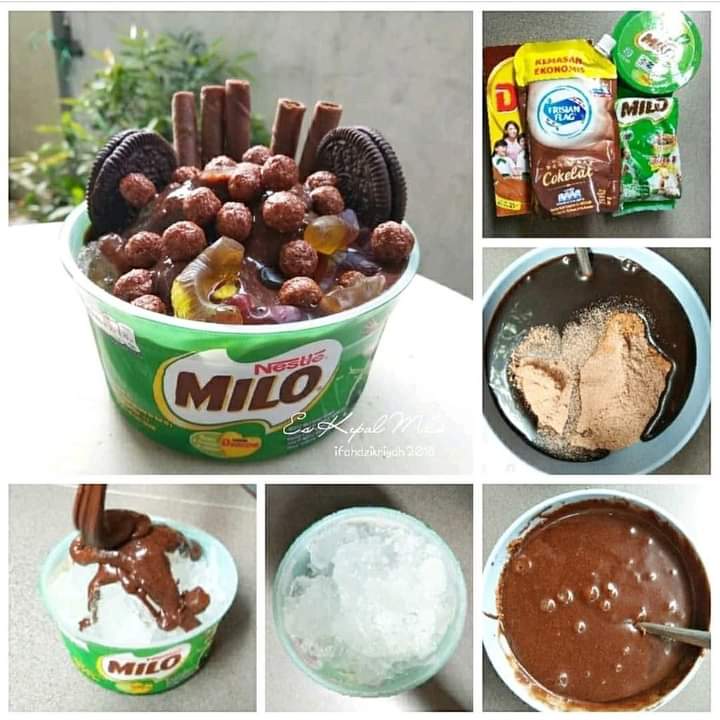 ice cubes that have been shaved / crushed then lay on top of the milo container. Flush the milk mixture and give the topping according to taste. enjoy it.