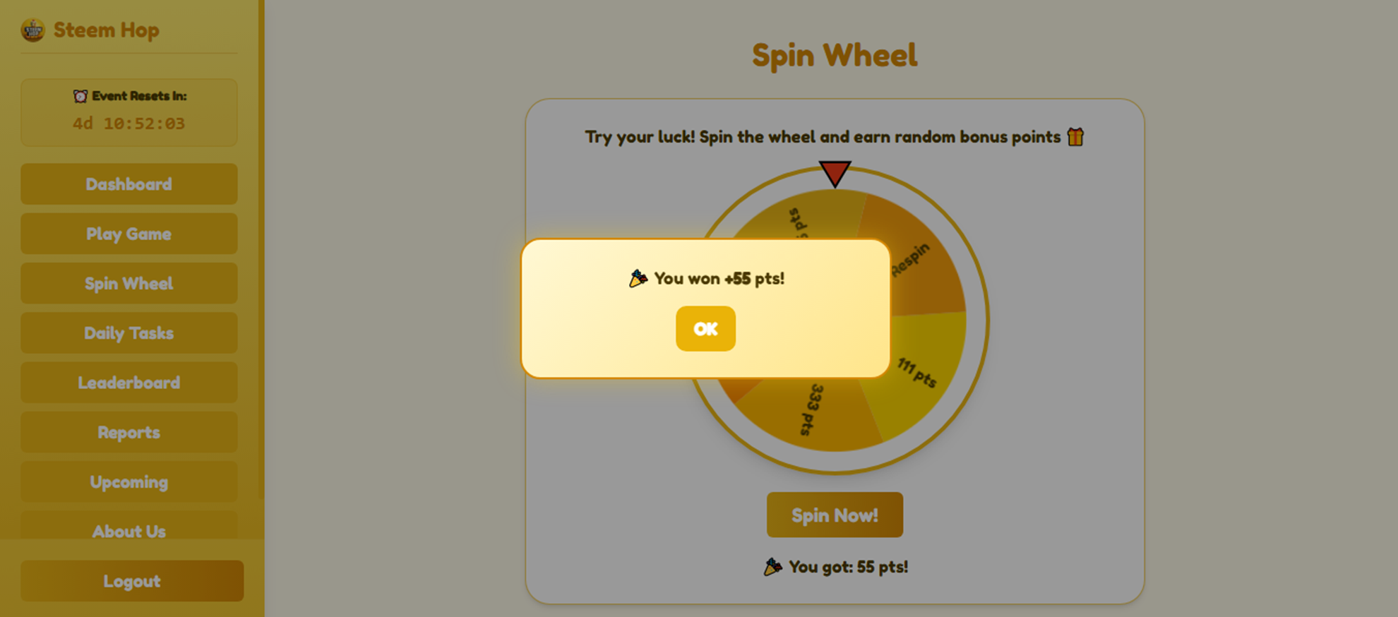 Como ocurre en cualquier inicio, tuve que explorar la pantalla principal. Encontré la opción Spin Wheel, me otorgó 55 puntos, ésto me recordó que recibí 10 puntos solo por acceder al juego.