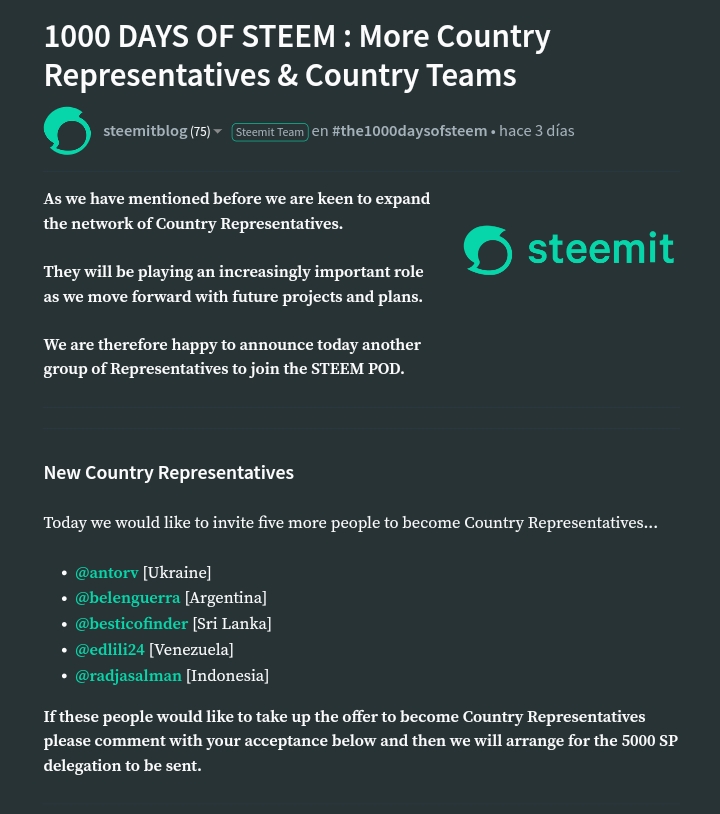 Mi respuesta para ser representante de país fue el mismo día en la madrugada, aunque un poco sorprendida porque me empezaron a llegar varias notificaciones de usuarios de otro país felicitándome por el anuncio, y fue esto lo que me llevo a leer la mención de @steemitblog aunque no hablo fluidamente el inglés lo leo y lo de traduzco en un poco más del 60% sin traductores, pude traducir la mención y aceptar ser representante de mi país Venezuela 🇻🇪 junto a mujeres dedicadas y esforzadas como @mariita52 @anasuleidy y @tocho2 para mí es un placer trabajar en este hermoso equipo, trabajo que ya empezó gracias a la delegación de 5000SP que me hicieron llegar.