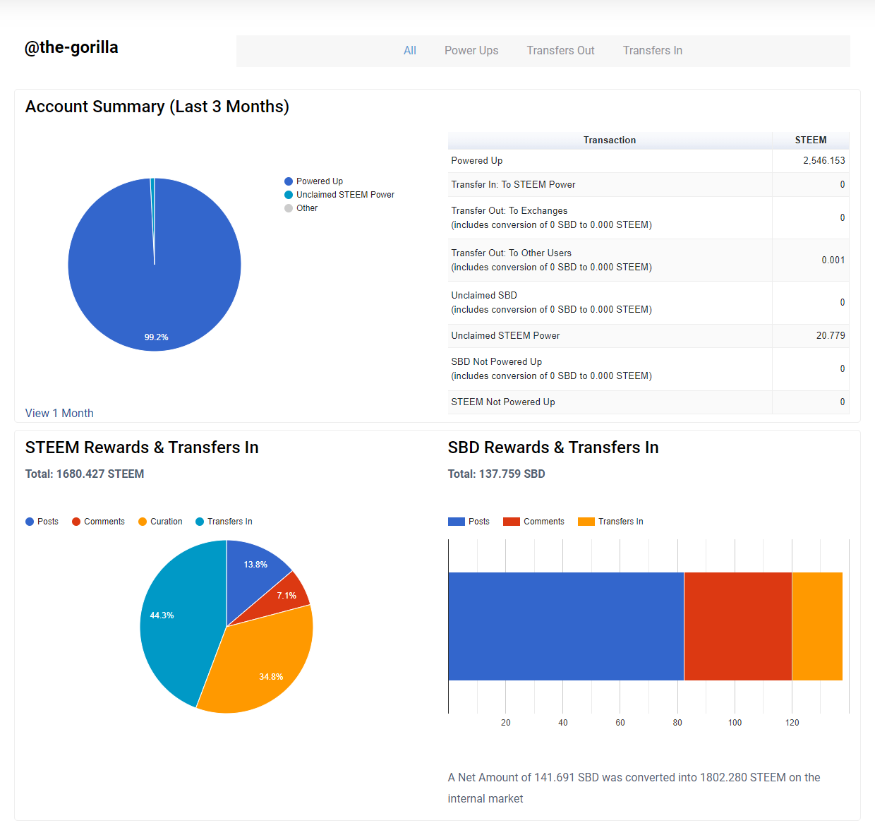 @remlaps highlighted that some Transfers In go straight into STEEM Power and not via the wallet. These Transfers In are now included in the summary pie chart and accompanying table under the title "Transfer In: To STEEM Power" and are also included within the "STEEM Rewards & Transfers In" and the "Transfers In" tab - with a memo saying "To Steem Power".