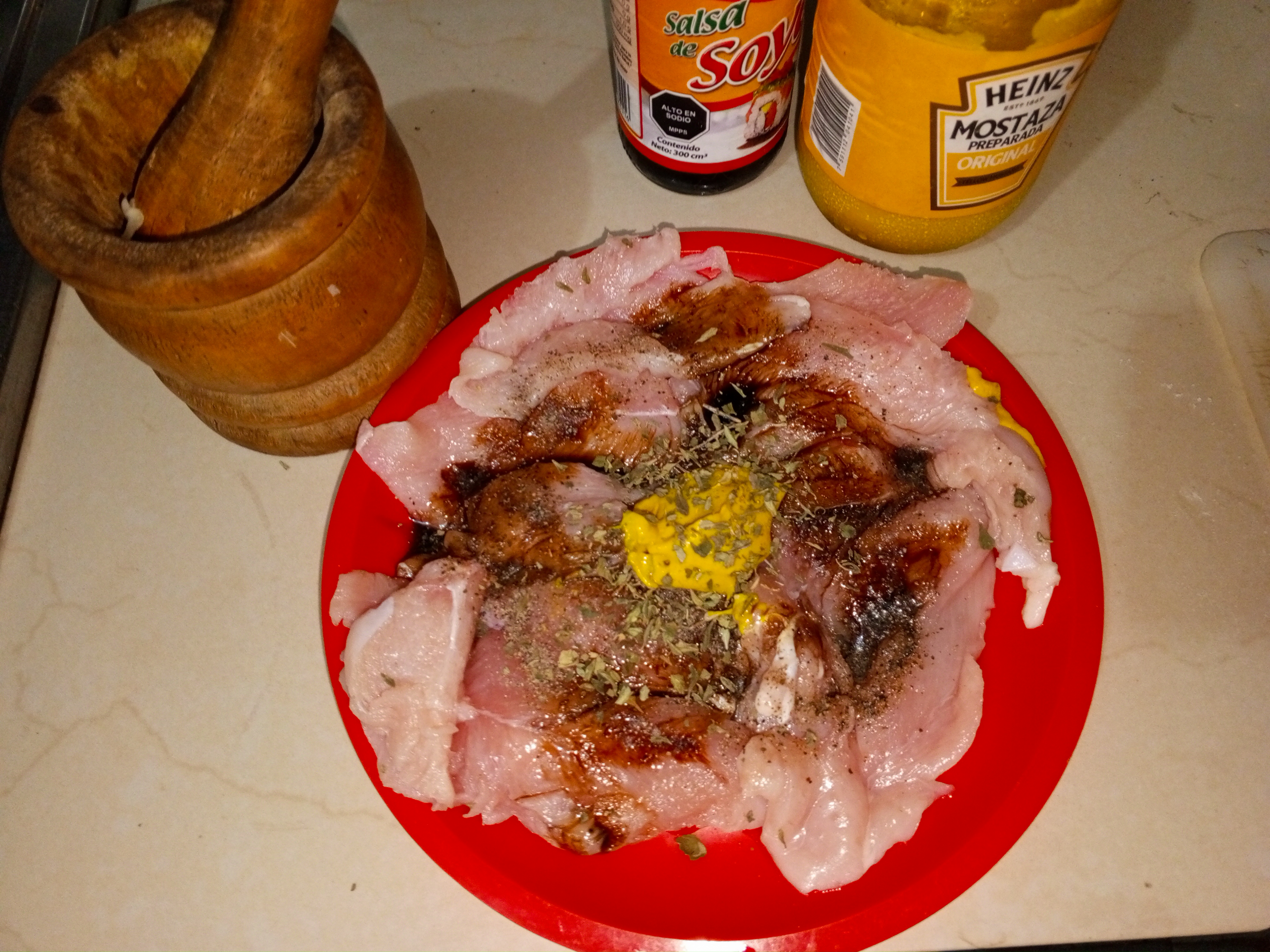Bueno mis queridos chefs me decidí hoy a preparar unas pechugas de pollo para almorzar las cuales Sazone con los siguientes ingredientes :Mostaza , sal ,ajo , pimienta ,salsa de soya y orégano esta receta es facil de elaborar y no me quita mucho tiempo ya que en ocasiones puedo macerar las pechugas de pollo desde el día anterior