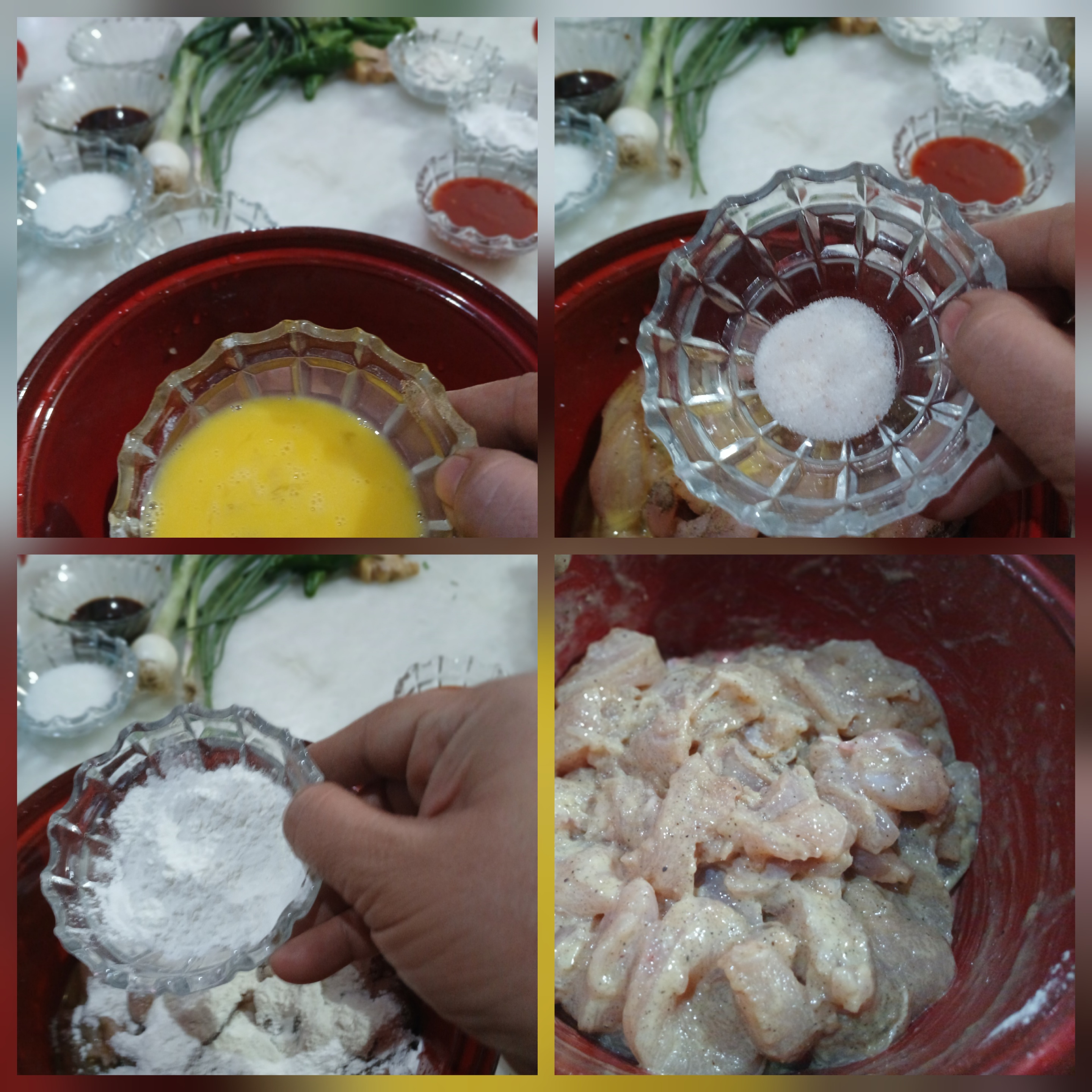 -In a bowl,add chicken,egg,salt,black pepper powder,cornflour,all-purpose flour & mix well,cover & marinate for 15 minutes.Step 2 :