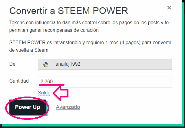 Llenamos los datos en este caso como yo quiero pasar todo el steemt a POWER UP le di clic a Saldo, pero puedes colocar en la cantidad lo que tu desees. Luego de llenar la cantidad hacemos clic a Power up