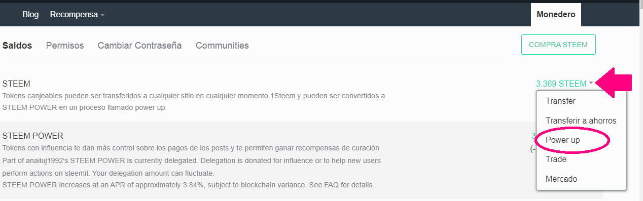 Hacemos clic en la flechita de STEEM y luego clic a Power UP