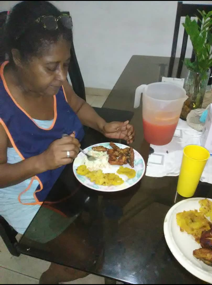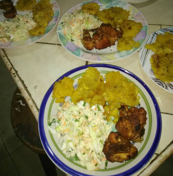 Prepare una sabrosa ensalada rallada, con pollo frito y tostones, tambien debia hacerle el almuerzo a mi hijo y al Sr. Teran.