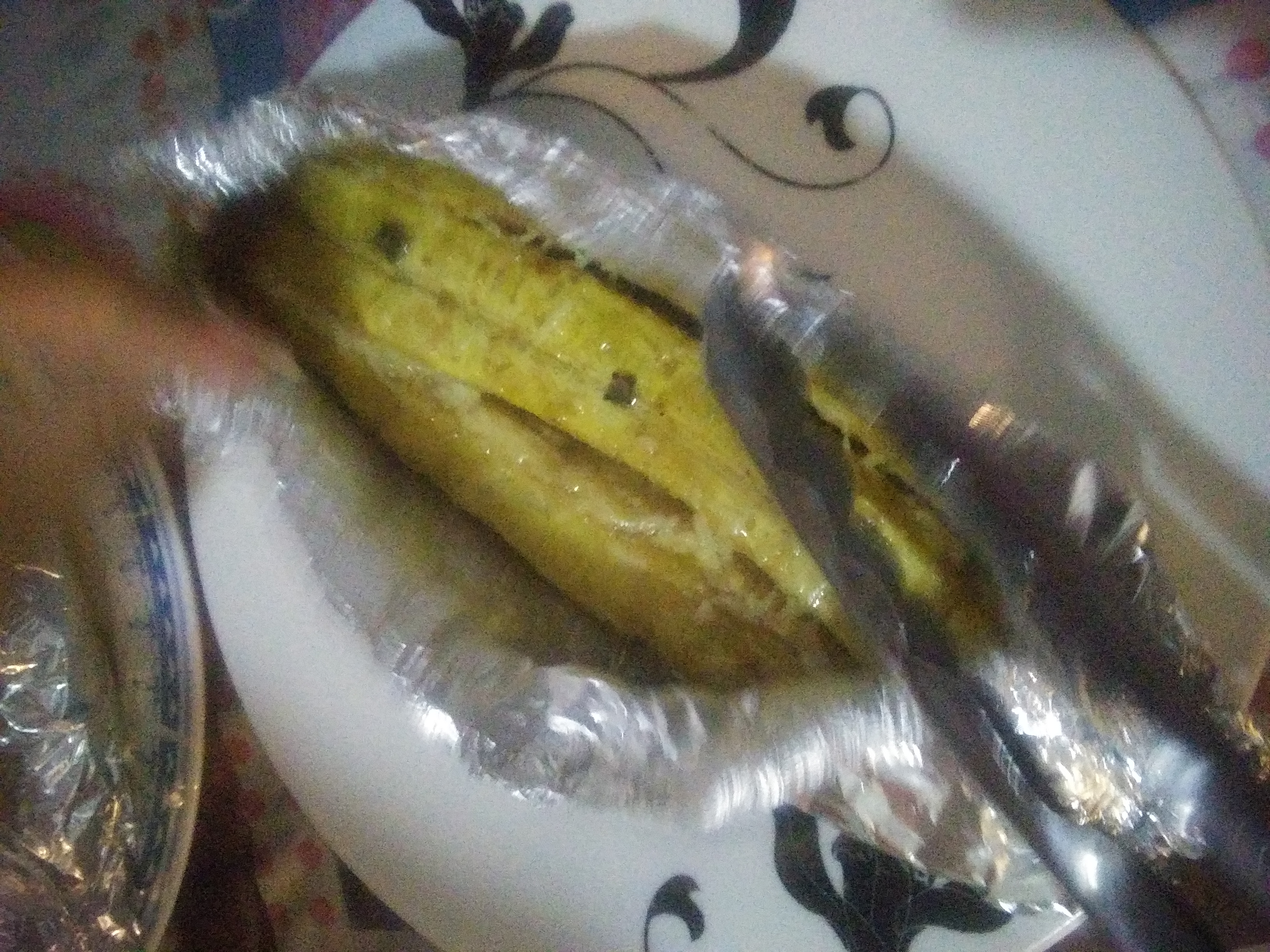 Al regresar mi hija hizo unos ricos platanos al horno y me dio una para probar su nueva receta