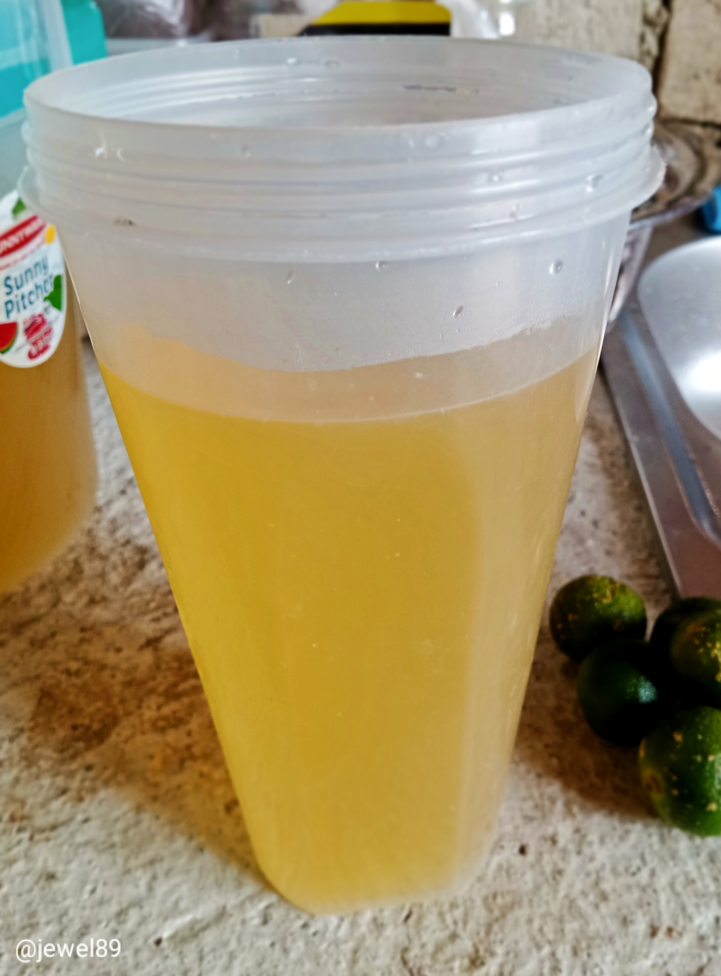 Maghiwa ng kalamansi or Lemon, It's up you po kung ilang kalamansi ang ilalagay nyu. Saaken po mga bente pirasong kalamansi ang nilagay ko. Kapag lemon naman mga tatlong piraso. Salain din po kapag ipipiga pra hindi maisama mga buto.