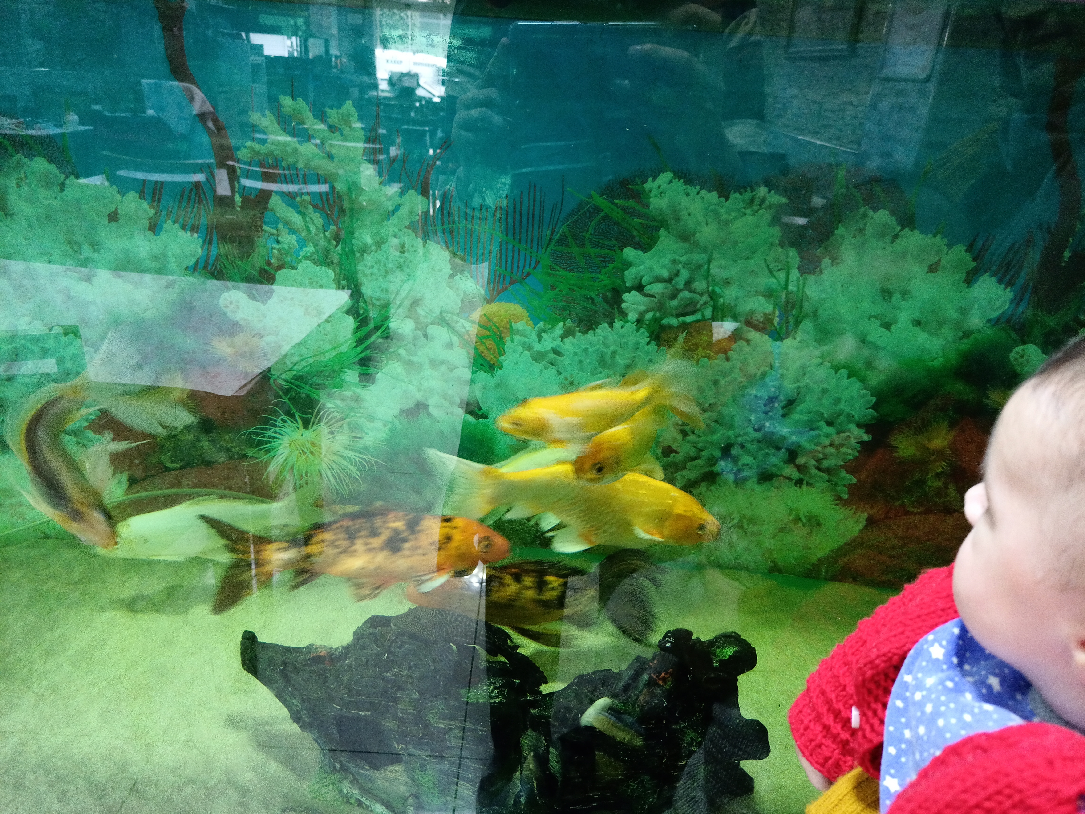 Biz yemeğimizi yerken oğlumun dikkatini balıklar çekti, sürekli hareket halinde oldukları için olsa gerek. O anda resimlemek istedim ve ortaya böyle harika bi görüntü çıktı. 🥰 Yakışıklım aynı zamanda çok ta fotojenik maşallah. Hareket eden renkli şeyler çok dikkatini çekmeye başladı. Artık büyüdü etrafını algılıyor seçiyor takip ediyor..