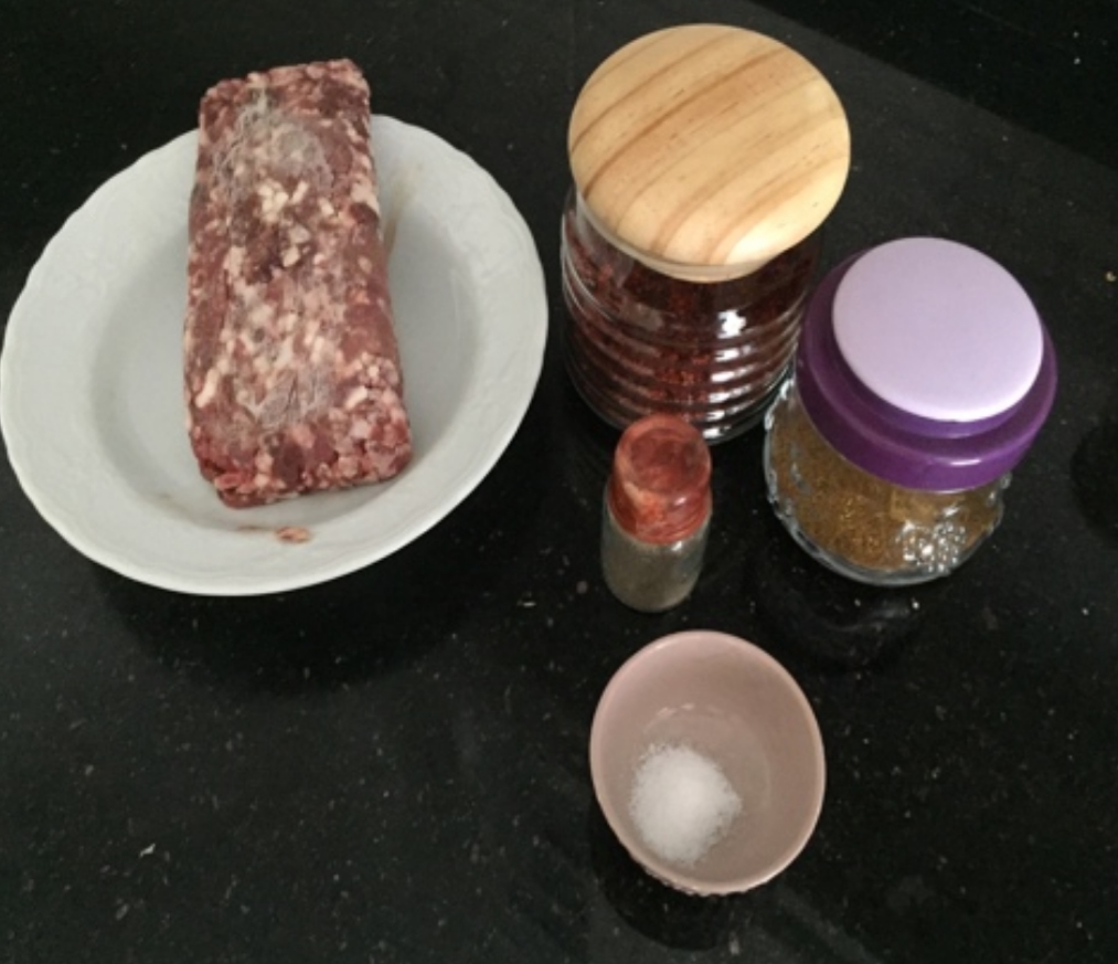 • Hamburger köftesi için kıymaya tuz, karabiber, kimyon, toz biber ve domates tozu ilave edilir ve iyice yoğrulur. Bu aşamada kıvamını arttırmak için ekmek eklenebilir.