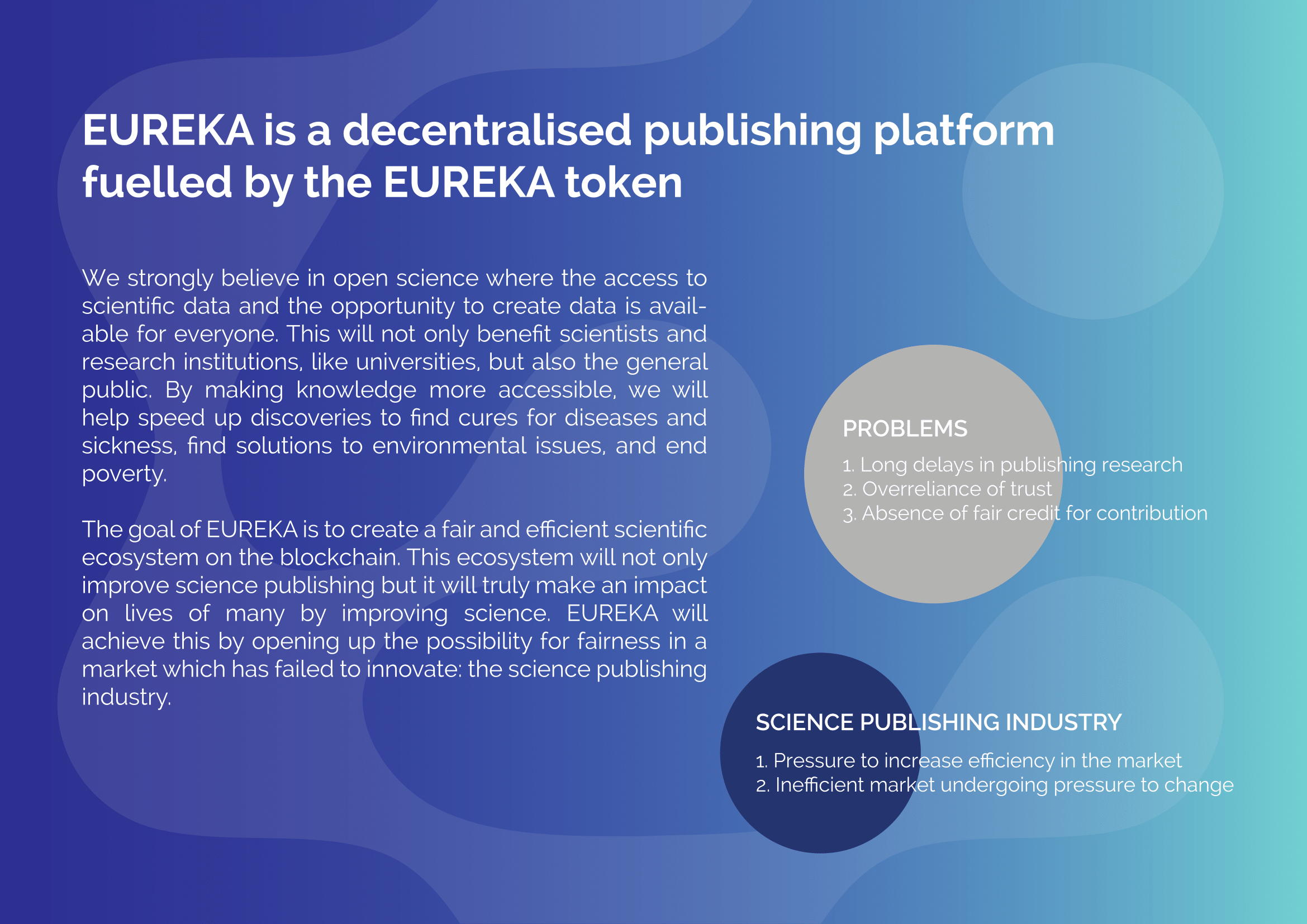 EUREKA tokens will be used to reward reviewers to conduct peer reviews, to reward reproducibility studies, reward studies which give negative as well as positive results and also enable funding of hypothesis and scientific proposals. The tokens will also grant voting rights to the holders, allowing them to influence decisions put to a vote, and also to rate by upvoting and downvoting on scientific studies. Currently, most peer reviews are carried out for free by academics who have the luxury of being able to donate their time to journals. This leads to very long wait times, and it severely limits the number of articles that can be reviewed and published. By incentivising reviewers with EUREKA tokens which will vary automatically depending on demand, this will accelerate the peer review process by making peer reviewing accessible to a larger pool of qualified academics. However, not only reviewers can be incentivised, token payments will also go to referenced authors.