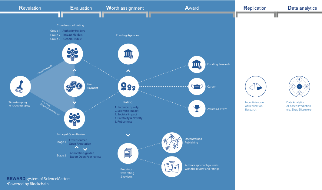 The advantages of using blockchain technology within the scientific research process are numerous. First, data recorded on a blockchain is immutable and cannot be tampered with. Secondly, it is decentralised and open, meaning it can be verified by anyone. Using smart contracts, we can automate the transfer of ratings and rewards in a fast and fair manner.