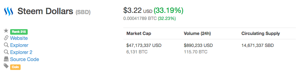 Yesterday I woke up with a shockingly pleasant surprise: CoinMarketCap listed SBD at $2.51 a 43.29% jump overnight. Wow that was indeed amazing: