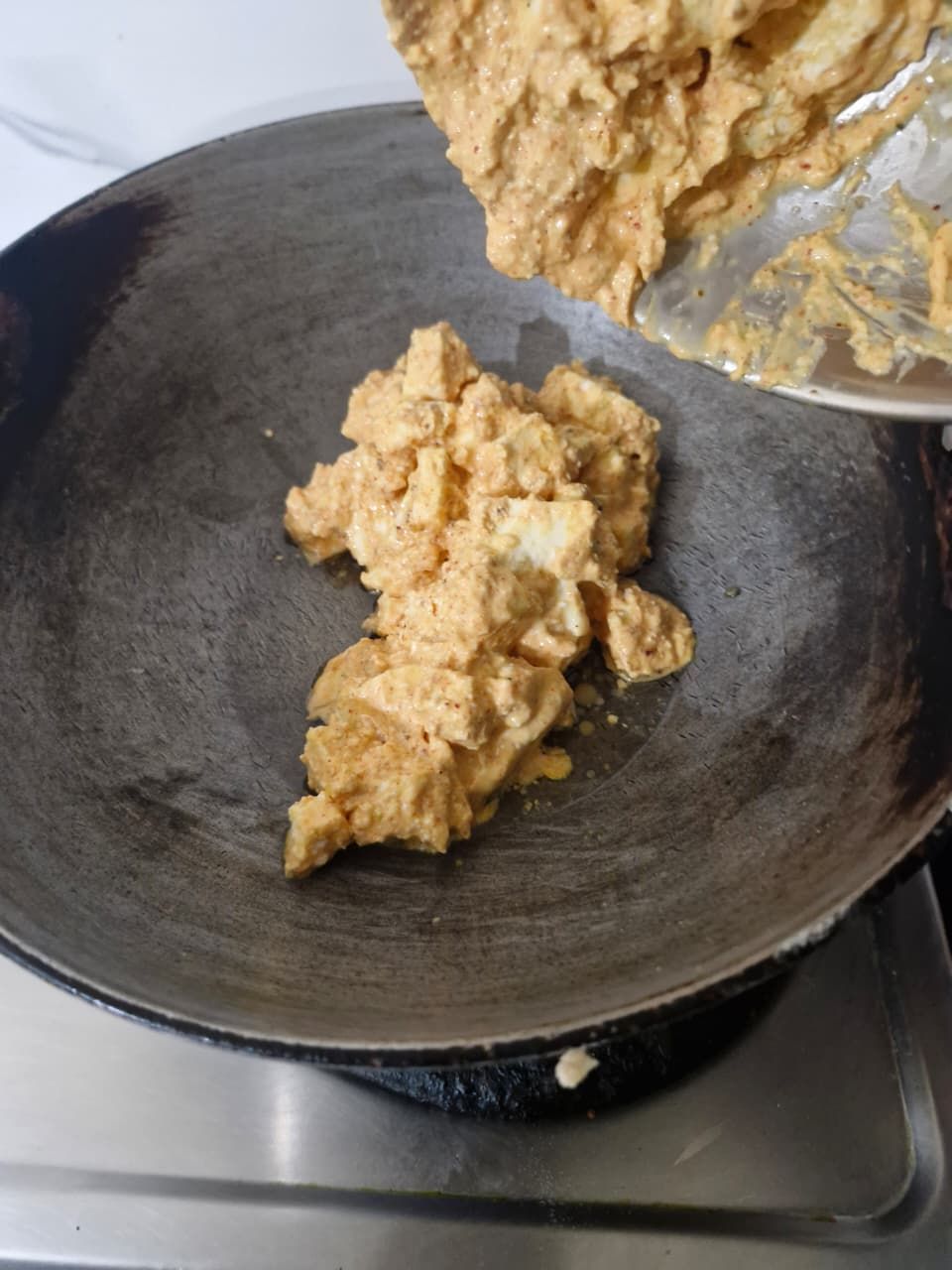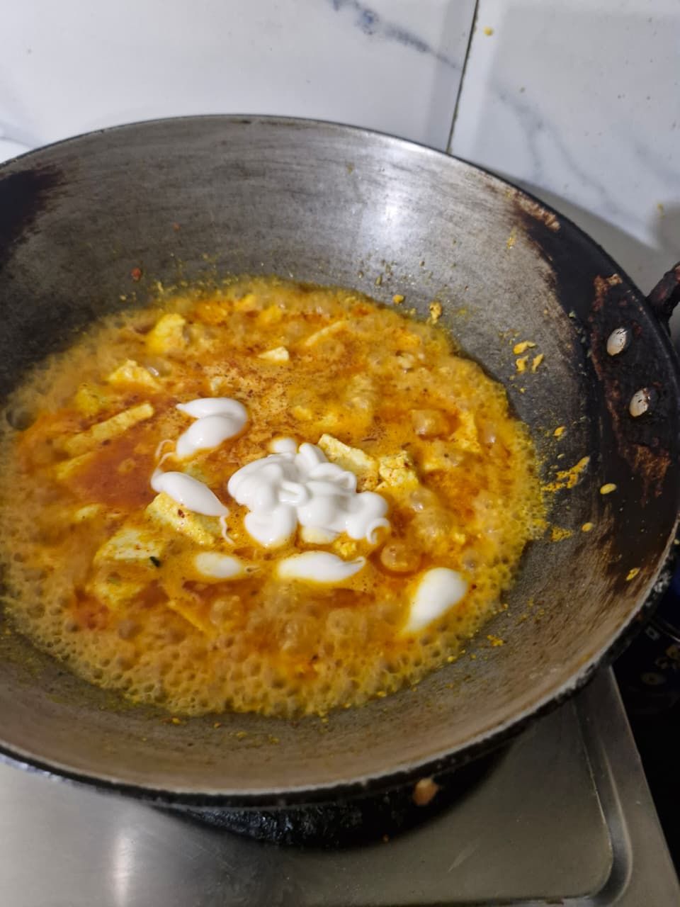 Keep this on low flame. Since it contains curd, it will start releasing oil; then, add a little mayonnaise to it.
