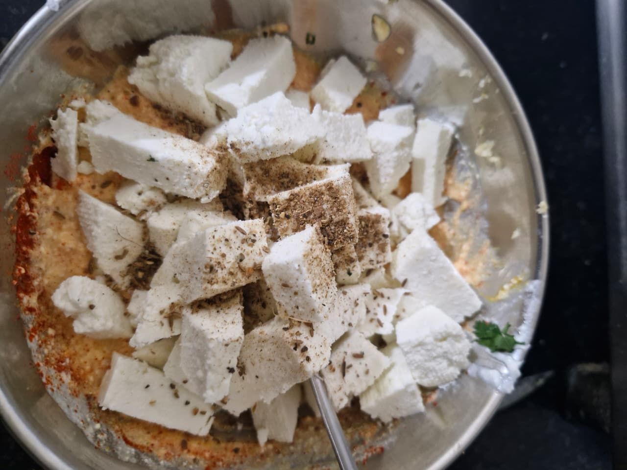 Now add the marinated paneer.