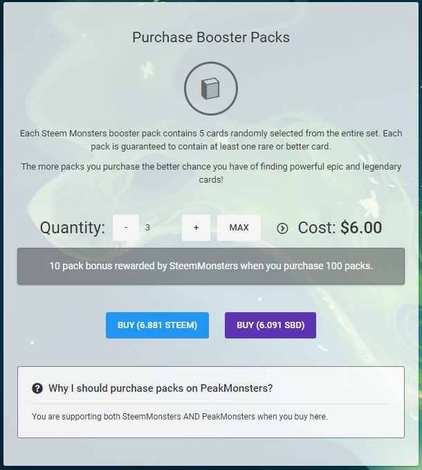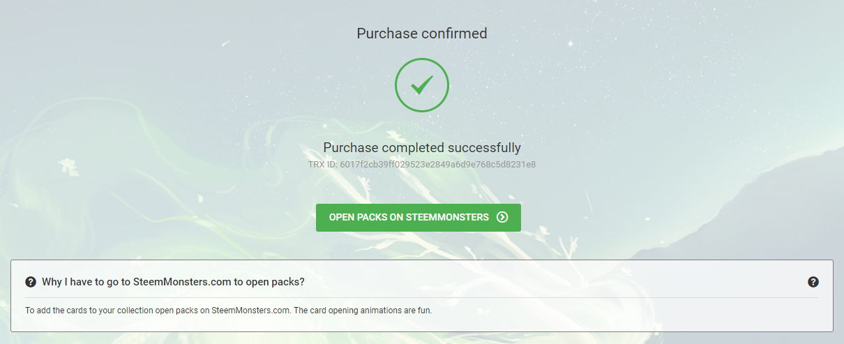 The price for the 3 packs were 6 USD, or 6.881 Steem or 6.091 SBD. I went with SBD today and quickly paid for my packs. After you paid you get your confirmation and can open your packs normally on the Steem Monsters website.
