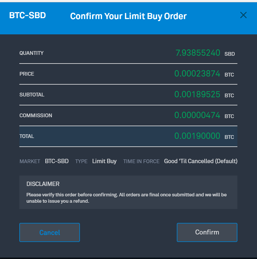 Podemos concluir que el proceso vía Exchange interno es más simple que usando un Exchange externo como bittrex, pero por la misma cantidad de BTC, obtendremos menos SBD en el Exchange interno que en un Exchange.