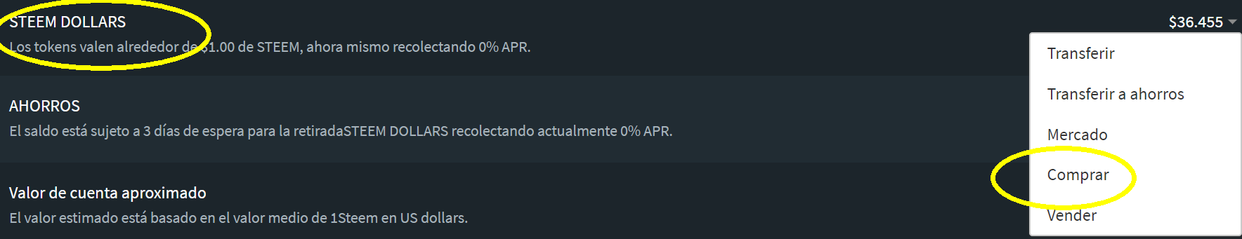 Comencemos por la forma más simple que es comprando SBD en el Exchange interno de steemit. Primero nos vamos al monedero y en steem dollar vamos a la opción comprar.