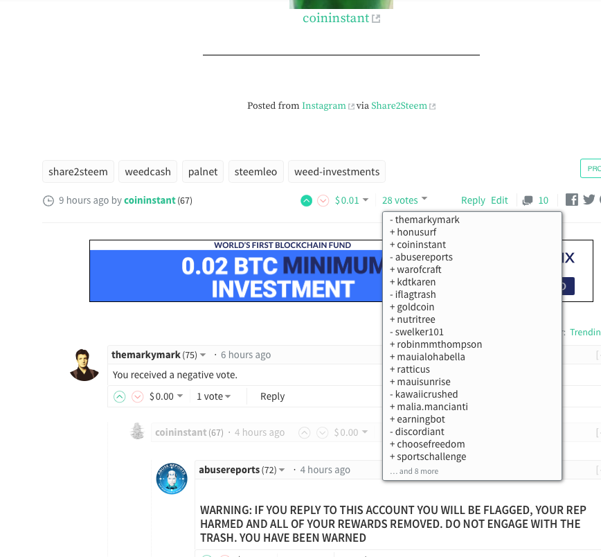 @coffeebuds said he wanted to block me, and since my vote did not seem to work today I assumed he had gone through with it. This letter was also in response to @berniesanders Very First Wedcash.Network Post! He was asking "Rhetorically"what was the difference between WEED & SMOKE! WCN VS Smoke.io! My Response, I told everybody WEED is a token, and SMOKE is a true SMT! Then they all proceeded to flag my response! lol