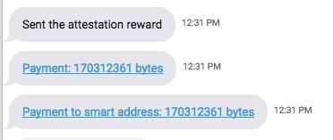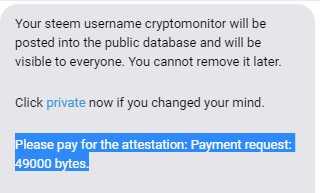 The bot will then ask if you want to store your username private (in your own wallet and only a hash i published) or public (details visible in the Byteball DAG). To enable others to send funds to your username instead of your wallet address, you must choose public.Finally, the bot will ask you to pay the attestation fee (which i sent you in step 3), to cover the transaction fee of storing the attestation (private or public) on the DAG. Simply click blue line with LINK “Please pay for the attestation: Payment request: 49000 bytes.” and then click SEND.