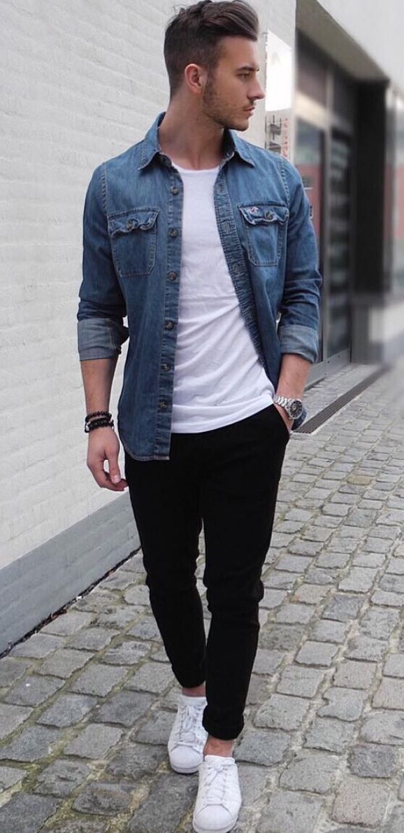 This outfit is very simple but perfect looking style pair a white T-shirt with a blue denim shirt and black denim jeans one thing here wear dark blue denim shirt otherwise it will not go with white t-shirt wearing white shoes to perfect this look wear one or two accessories like bracelets and watch