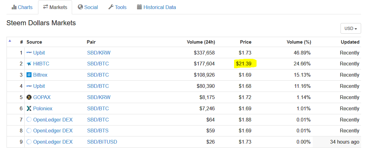 I am a little bit confuse too, that price it's not right, no sane person will buy SBD for that price. Someone is gaining something from that price.